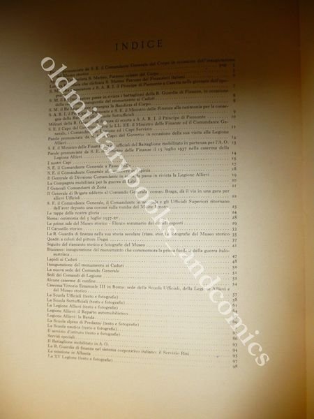 DESCRIZIONE: Luigi Alfieri Milano-Roma 1937 br. ed. ill. pp. 100 numerosissime ill. b/n e 4 tavv. a col. di Degai f.t., in 4°. Il volume illustra, con ampia documentazione fotografica, l'apertura delle sale del Museo Storico della Guardia di Finanza, ed illustra anche le azioni svolte dalla G.d.F. CONDIZIONI DELL'OGGETTO: Ottime, timbro e firma d'appartenenza alla prima bianca. PESO/WEIGHT: 488 gr. without package