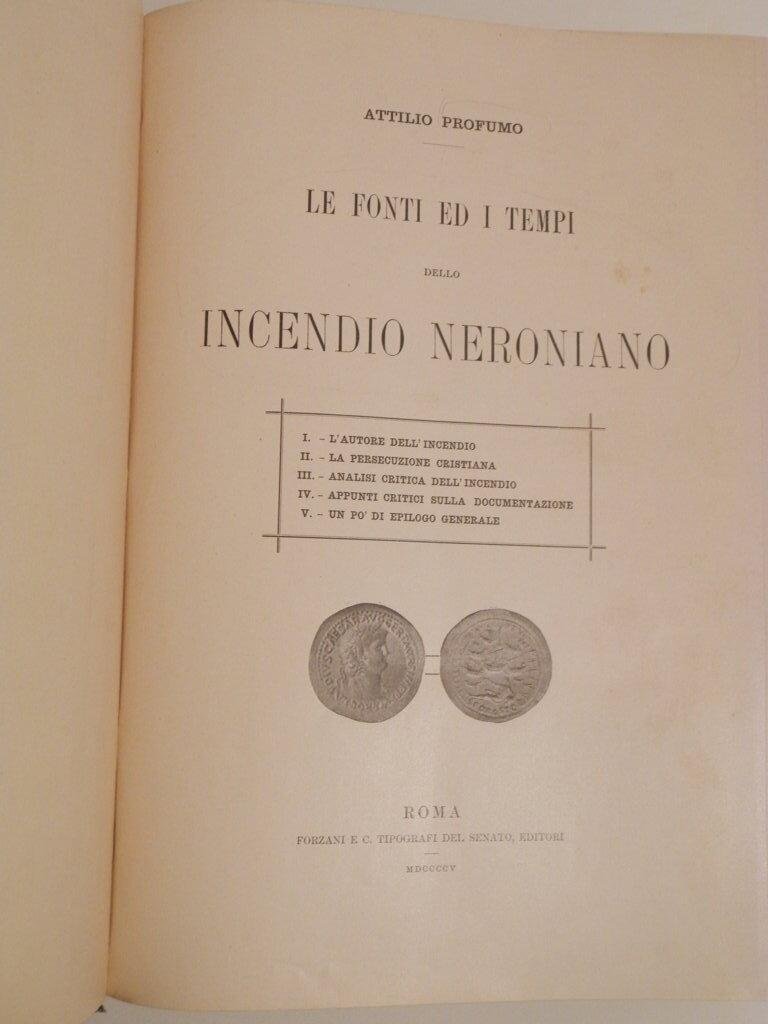 4°, 35 cm, pp. X, 718, 3 tavole fuori testo. Rilegatura coeva in mezza tela con angoli, titolo in oro al dorso, piatti marmorizzati, esemplare molto buono. Corposa opera di analisi dei testi storici dell'epoca in cui avvenne il celebre incendio. *** TUTTI I NOSTRI LIBRI SONO VISIBILI PREVIO CONTATTO MAIL O TELEFONO NELLA NUOVA SEDE DI MILANO: LIBRERIA COSMOPOLIS, VIA JOMMELLI, 22. ***