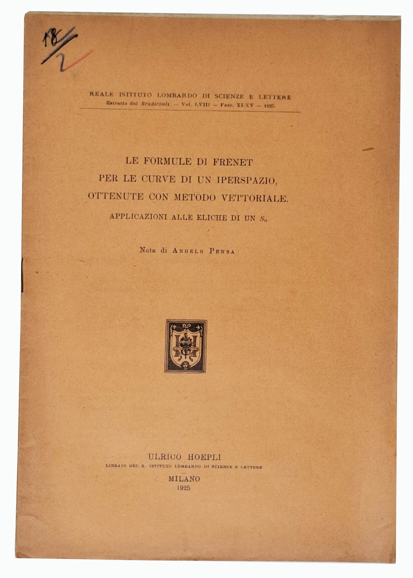Nota di Angelo Pensa (matematico piemontese), estratta dai rendiconti del 'Reale Istituto Lombardo di Scienze e Lettere' (adunanza del 2 luglio 1925). Pagine: [20]. Formato: 17 x 24,5 cm circa. Stato di conservazione: decisamente buono (si segnala esclusivamente un numero di classificazione, creato dall'autore per conservare in ordine cronologico i suoi opuscoli, sull'angolo superiore sinistro della copertina anteriore). In brossura.