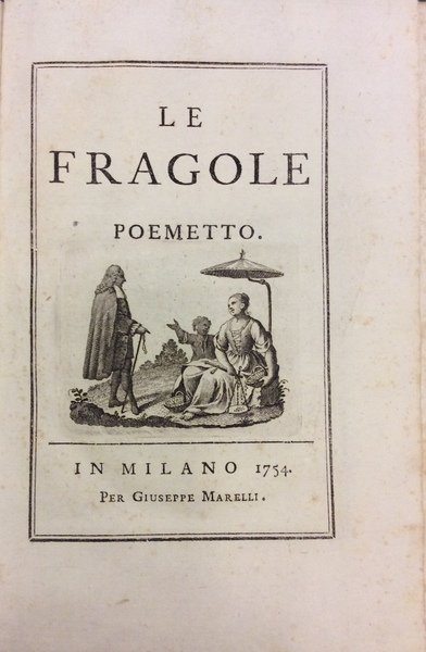 In-16 gr. (mm. 195 x 125), 3 opere in 1 volume, cartoncino rustico coevo, pp. 54,(2), graziosa vignetta al frontespizio, ornato da due bellissime inc. in rame: un finale (mazzo di fiori) e una testata di gusto campestre; testo in doppio filetto. Cfr. Melzi,I, p. 427: "E' questa la III ediz., nè si sa perchè siavi stato omesso il nome del P. Giovambattista Roberti, gesuita, che trovasi nella dedica dell'ediz. di Bologna, Della Volpe, 1752" - Westbury Italian Cookery Books, p. 189. Unito a:"La Moda" - Poemetto dedicato a due eccellentissimi sposi viniziani Antonio Ruzini e Arpalice Manini nell'anno 1746. Milano, Marelli, 1754, testo in doppio filetto. Terza edizione. Cfr. Melzi,II, p. 200 che cita la prima del 1746 e precisa: "l'ediz. di Milano, Marelli, è senza le prefazioni e con cambiamenti". Unito a:"Le Raccolte". Poemetto. Al nobilissimo Signore Andrea Cornaro. Terza ediz. Venezia, 1758, pp. 64, tit. in rosso e nero. Cfr. Melzi,II, p. 400: "Ebbe questo poemetto, in ottava rima, del P. Saverio Bettinelli, gesuita, varie altre ristampe". Esemplare. ben conservato.