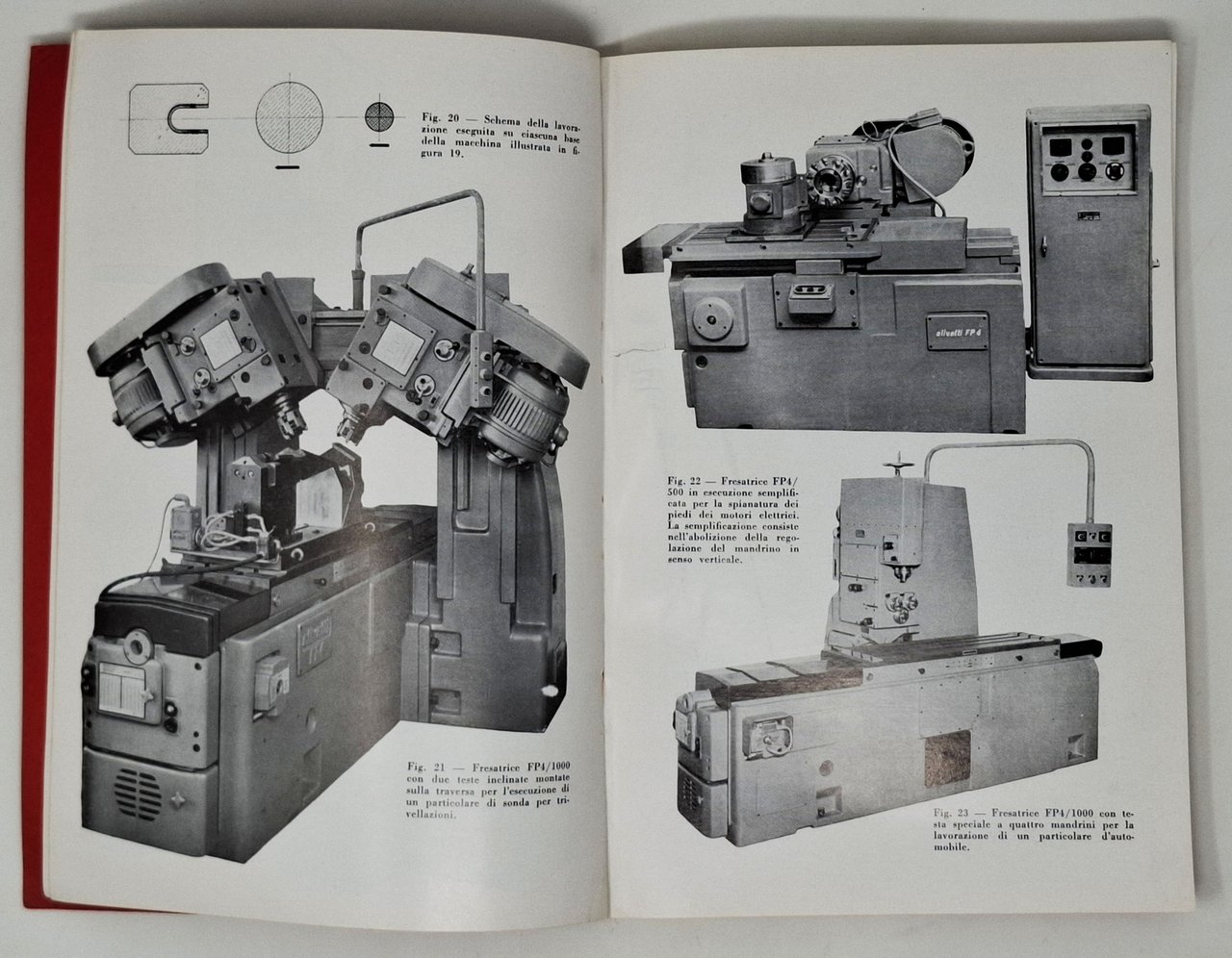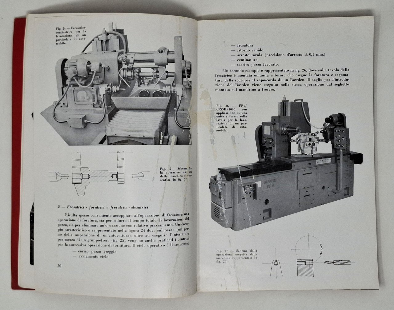Estratto dal volume LE FRESATRICI, della serie 'Macchine Utensili', diretta da Antonio De Majo con la collaborazione della Unione Costruttori Italiani di Macchine Utensili (U.C.I.M.U.). Stato di conservazione:in passato il volume deve essere stato conservato in un ambiente umido che ha causato alcuni difetti: un leggero odore (tipico degli ambienti chiusi), le due pagine frontali 20 - 21 si erano attaccate tra di loro e nello staccarsi si sono formate delle abrasioni che, comunque, non precludono la lettura del testo, piccole tracce di rosso (della copertina) sui bordi delle pagine frontali al retro dei piatti, una piccola firma d'appartenenza sul margine superiore del primo foglio bianco. Nel complesso, comunque, un esemplare discreto. Copertina editoriale flessibile. Numerose illustrazioni fotografiche e disegni in nero nel testo dei vari macchinari. Pubblicazione tecnica di non facile reperimento.