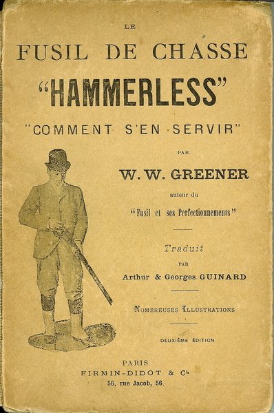 Paris, Firmin-Didot & Cie, S. d. (1894). In/8, couverture cartonnée illustrée. 390 pages. 13 ff. n. ch., frontispice, de nombreuses figures en noir dans le texte et 12 planches en noir h.-texte sur papier couché. Dos habilement restauré. Le fusil de chasse, son invention, son histoire et ses variétés. Du choix et du montage d’un fusil. Poudres, plombs et cartouches. Le fusil : la manière de s’en servir. Tir aux pigeons vivants et artificiels. Les carabines anciennes et modernes. Les premiers gros calibres. Pratique du tir. Traduit par Arthur et Georges Guinard. Peu commun. Thiébaud, 475.