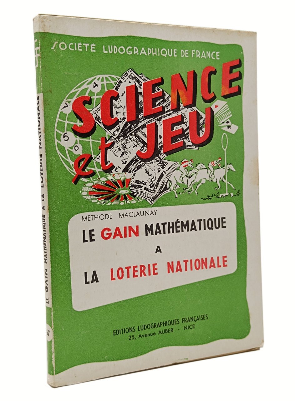 Formato: 13,5 x 19 cm circa. Pagine: [8] + 90 + [14]. Lingua del testo: francese. Ottimo esemplare, ancora intonso. brossura editoriale con copertina flessibile illustrata a colori. Con tabelle e grafici in nero nel testo. Il volumetto illustra, in maniera dettagliata, il metodo Maclaunay per giocare e vincere (secondo un metodo matematico) alla lotteria nazionale. Non comune.