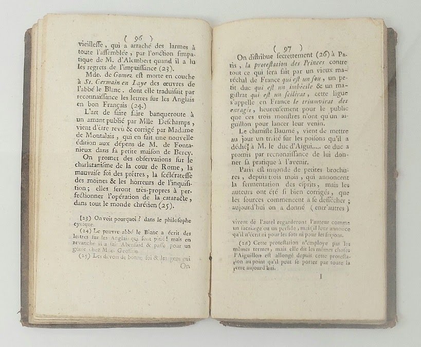 >in-8 (160x90 mm), pp. 188, legatura coeva in p. pelle, filetti oro e titolo al dorso a nervi (difetti alle cerniere e alle cuffie). Edizione coeva all'originale, ma diversa e non censita da Gallica, le differenze sono infatti molteplici: paginazione diversa, priva dell'antiporta, del Explication du Frontispiece, e con l'Avis aux Lecteurs molto più breve, in cui l'Errata con le correzioni dell'Autore non viene menzionata, ed è infatti assente, inoltre il numero di note a pié di pagina sono più copiose in questa edizione (in numeri, e non in lettere). Pamphlet considerato tra i più grandi successi della letteratura clandestina della fine del XVIII secolo. L'opera denuncia il «despotisme ministériel», contiene aneddoti sugli scandali nobiliari e sulla crisi della regalità. L'autore fu feroce contestatore di arroganze, privilegi, disservizi e depravazione dell'Ancien Regime. Buon esemplare, alcune pagine con inchiostratura molto debole, al contropiatto anteriore firme di possesso cassate e parzialmente coperte dall'ex-libris del Capitano Carlo Pavesi. Barbier, II, 523. Darnton, Il Corpus della letteratura clandestina in Francia 1769-1789, no. 267; Gay II, 393.