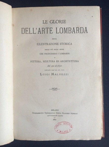 LE GLORIE DELL'ARTE LOMBARDA OSSIA ILLUSTRAZIONE STORICA DELLE PIÙ BELLE OPERE CHE PRODUSSERO I LOMBARDI IN PITTURA, SCULTURA ED ARCHITETTURA DAL 590 AL 1850. Milano, Stabilimento Tipografico Ditta Giacomo Agnelli nell'Orfanotrofio Maschile 1882
