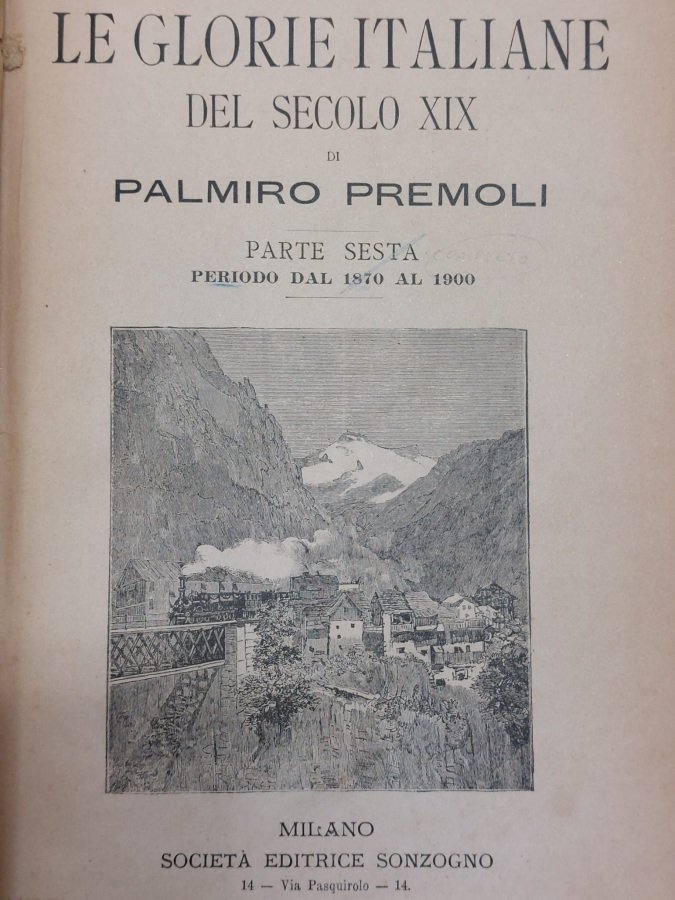 In-4º (cm. 26), legatura coeva in t. tela con titolo in oro al dorso (lievi segni d'uso), risguardi decorati, carte in ottimo stato; completo di tutte le dispense in cui uscì la pubblicazione, qui rilegata in un unico voluminoso tomo (occhietto e frontespizio sono ricavati dalla pubblicazione della parte sesta). Copre la storia d'Italia dal 1801 al 1900 con numerosissime illustrazioni intercalate n.t.; ricco anche di biografie di cui vi è un elenco in fine. Raro a trovarsi così completo. Buon esemplare. (SK6)