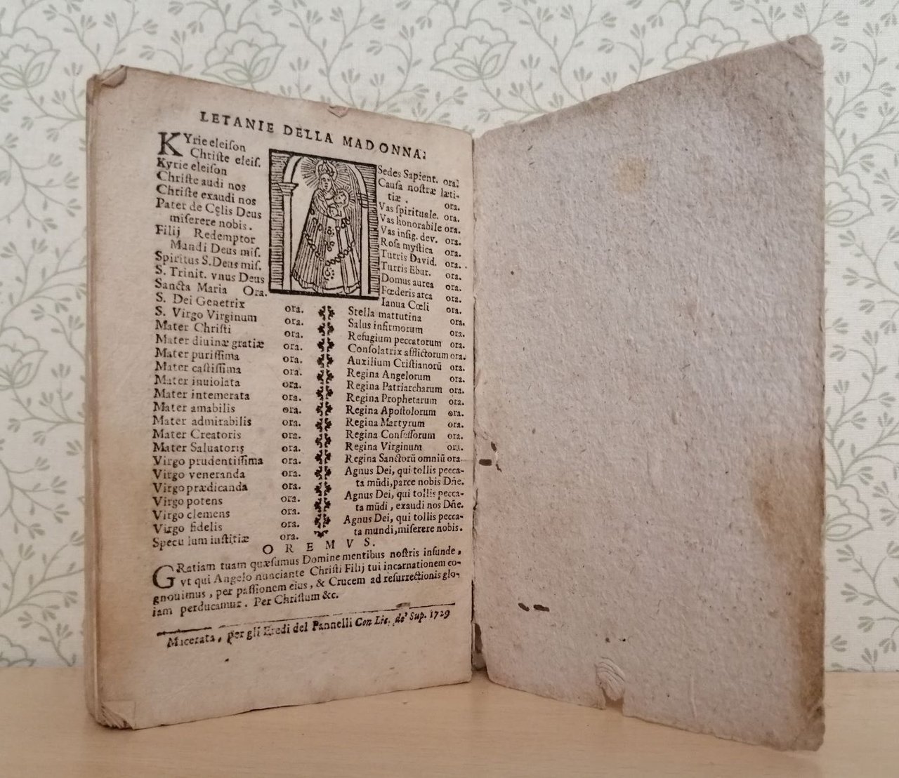 Volume in 8 piccolo, cartonatura coeva (mende al dorso), bellissima antiporta silografica con la Santa Casa trasportata dagli angeli con una lunga didascalia in calce, frontespizio inquadrato con vignetta silografica, due carte, 119 pp., al verso dell'ultima 'Litanie della Madonna' con piccola vignetta silografica coll'immagine della Signora di Loreto. Davvero difficile condensare la quantit di notizie che quest'opera contiene intorno alla Casa lauretana, e quanto sia intrigante ed avvolgente la lettura. Sicuramente opera di grandissimo interesse e di scarsa reperibilit, in pi che bello stato. Notevole