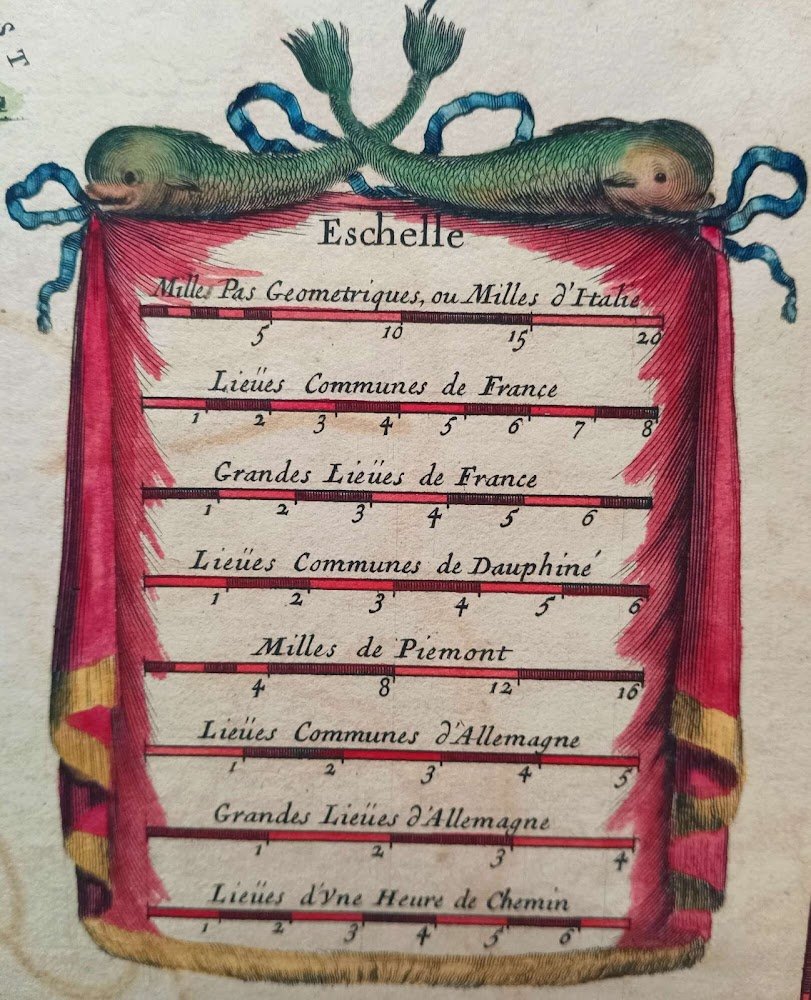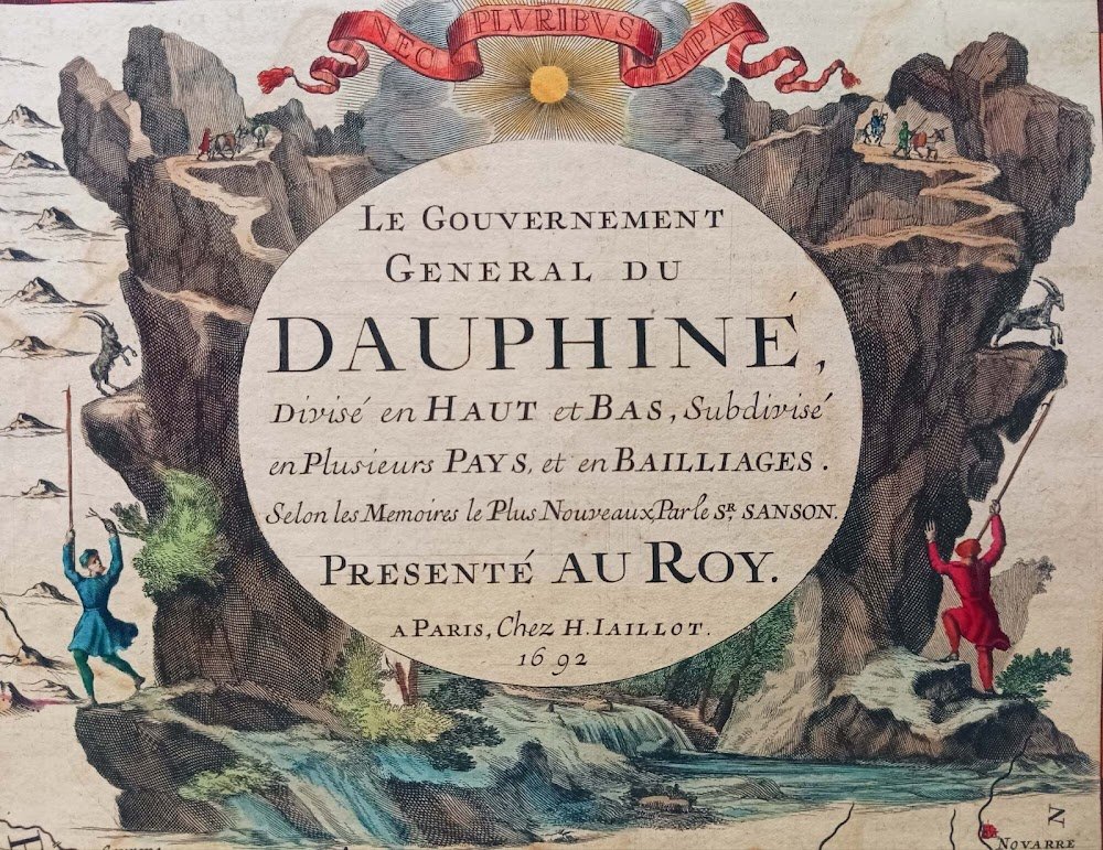 >Incisione originale su rame (mm 570 x 850), colorazione coeva, incisa da Jaillot su disegno di N. Sanson. Titolo lungo la parte superiore del rame, ripetuto entro medaglione, incorniciato da paesaggio montano e fluviale, con personaggi ed animali. In basso a destra, scala miliare entro cartiglio con decoro di pesci e drappi. Nitida e dettagliata carta geografica del Delfinato, così come era costituito prima della Guerra della Lega d'Augusto, detta dei Nove Anni, quando il duca di Savoia invase il Delfinato; la sua armata fu sconfitta dal maresciallo francese Nicolas Catinat e da Philis de La Charce alla guida di un esercito di contadini. Esemplare fresco e in buono stato di conservazione .