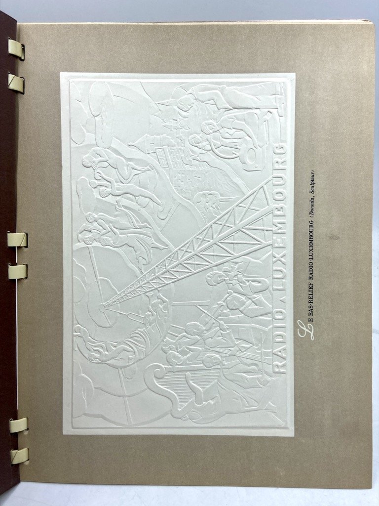 Legatura editoriale cartonata a spirale con sei anelli di plastica, piatto anteriore dorato con illustrazione impressa, cm 31 x 23.5, pp 31 (3) con illustrazioni in rotocalco seppia e fregi malva, 13 tavole in cartoncino con illustrazione a colori applicata, una grande illustrazione su tavola quadrupla ripiegata, una riproduzione di bassorilievo impressa a secco, una carta turistica su tavola metallizzata. Buono stato di conservazione, qualche pagina con rotture dei fori passa-anelli, leggeri ordinari segni d’uso. Album di presentazione del padiglione del Lussemburgo all'Esposizione Universale di Parigi del 1937, sontuosamente impresso dall'atelier di Jacques Makowsky con largo impiego delle stampe a rilievo e su metallo che contraddistinsero la sua produzione parigina. Un perfetto esempio dell'ultima stagione dell'art déco e un'efficace testimonianza del trionfo del modernismo che fu l'Expo di Parigi del 1937. Il volume raccoglie una presentazione di Léon Laval (Commissario Generale del Lussemburgo per l'Esposizione), un «Aperçu Historique» e una nota sul Turismo di Marcel Noppelney, interventi su «La langue et la culture françaises en Luxembourg» di Joseph Hansen e «La structure économique» di Paul Weber. Molto ricco l'apparato iconografico di gusto déco, con immagini del padiglione progettato da Nicolas Schmit-Noesen e delle decorazioni e opere custodite: la cancellata metallica di Michel Haagen, i bassorilievi disegnati da Pierre Blanc (facciata), Auguste Trémont e Lucien Wercollier, gli affreschi di Jean Schaack, Josy Meyers e Felix Glatz; le tavole a colori riproducono un ritratto della Gran Duchessa del Lussemburgo di Denis Etcheverry, acquerelli di Gay (vedute del padiglione) e dipinti di Pierre Lamboray, Lucien Simon, Joseph Kutter, Paul Jouve, Van der Meulen. Sono inoltre presenti tre tavole curate, come la copertina, da Makowsky: un pannello dello scultore Donada, «Le Bas-Relief Radio Luxembourg» riprodotto a rilievo, una grande veduta a colori del Bacino Minerario del Lussemburgo su due tavole doppie, e una carta turistica del Gran Ducato impressa a colori su cartoncino argentato. L'ebreo russo Jacques Makowsky (1894 - 1981) fu grafico e stampatore per lo Zar Nicola I prima di fuggire dalla Russia durante la Rivoluzione; stabilitosi a Parigi, sviluppò particolari procedimenti d'impressione su cartoncini metallizzati molto apprezzati dai contemporanei. L'invasione nazista costrinse nuovamente all'emigrazione Makowsky: nel 1940 si stabilì con la moglie Alphonsine negli USA e divenne allevatore di pollame, raggiungendo nuovamente la notorietà grazie a particolari incroci della gallina della Cornovaglia.
