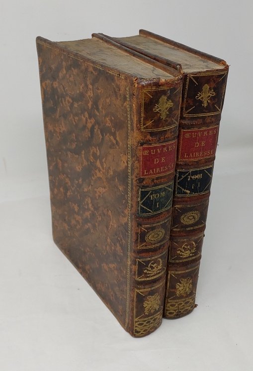 >2 volumi in-4, pp.XXII, 527, 662, con 35 tavole illustrative incise f.testo, alcune ripiegate. Legatura coeva p.pelle marmorizzata, bordura oro sui piatti, dorsi riccam. ornati ai piccoli ferri e titolo in oro. Gérard de Lairesse (1631-1711) nato in Belgio, fu noto pittore e incisore. Scrisse il presente vasto e importante trattato sulla teorica della pittura dopo i 50 anni di età, dettandolo interamente al figlio essendo divenuto totalmente non vedente. La presente sua opera fu assai apprezzata e ristampata due volte tradotta dall'originale in olandese. Ottimo esemplare. Bénézit, VIII, 177-178.