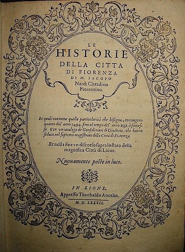 Le historie della città di Fiorenza. le quali con tutta quella particolarità che bisogna, contengono quanto dall’anno 1494 fino al tempo dell’anno 1531, è successo. Con un catalogo de’ Gonfalonieri di Giustitia, che hanno seduto nel supremo magistrato della Città di Fiorenza. Et nella un discorso sopra lo stato della magnifica Città di Lione.