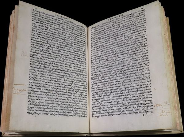 In 4° piccolo (20x14,2 cm); 54, (2 pp. ultima bianca) cc. Legatura muta della seconda metà del seicento in piena pergamena. Tagli spruzzati in rosso. Leggere tracce di polvere e duso al frontespizio. Sempre al frontespizio due forellini ai margini alto ed esterno bianchi del frontespizio, un leggerissimo alone al margine alto, tutti ininfluenti e per il resto in buone-ottime condizioni di conservazione. Qualche antica sottolineatura in matita rossa nel testo. Antica nota di possesso privata al frontespizio. Prima edizione di questa celeberrima opera dedicata alla storia di VeroSenza titolo-1na scritta dal celebre giureconsulto, notaio e storico veronese Sarayna (anche Saraina) Torello, considerata una delle prime e più autorevoli fonti per la storia locale veronese dalle origini al cinquecento. Lopera ripercorre le origini della città di Verona ed il suo sviluppo sotto il dominio scaligero nel trecento e quattrocento. Lultimo capitolo contiene linteressante Brieve descrittione de' come se ritrova il Paese di Verona" e il "Tenore del compromesso fatto sopra la pace già fatta da Ezzelino da Romano Podestà di Verona. e Rizzardo de S. bonifacio." Rif. Bibl.: Lozzi 6322; NUC vol. 520 p. 554; Adams S-394; BM-STC, p. 609; Maffei Verona illustrata, II p. 197; Giuliari, della tipografia veronese, pag. 58, n. XXX: "Nuovo carattere minuto corsivo usò in questa bella stampa il Portese .ed è la integra".