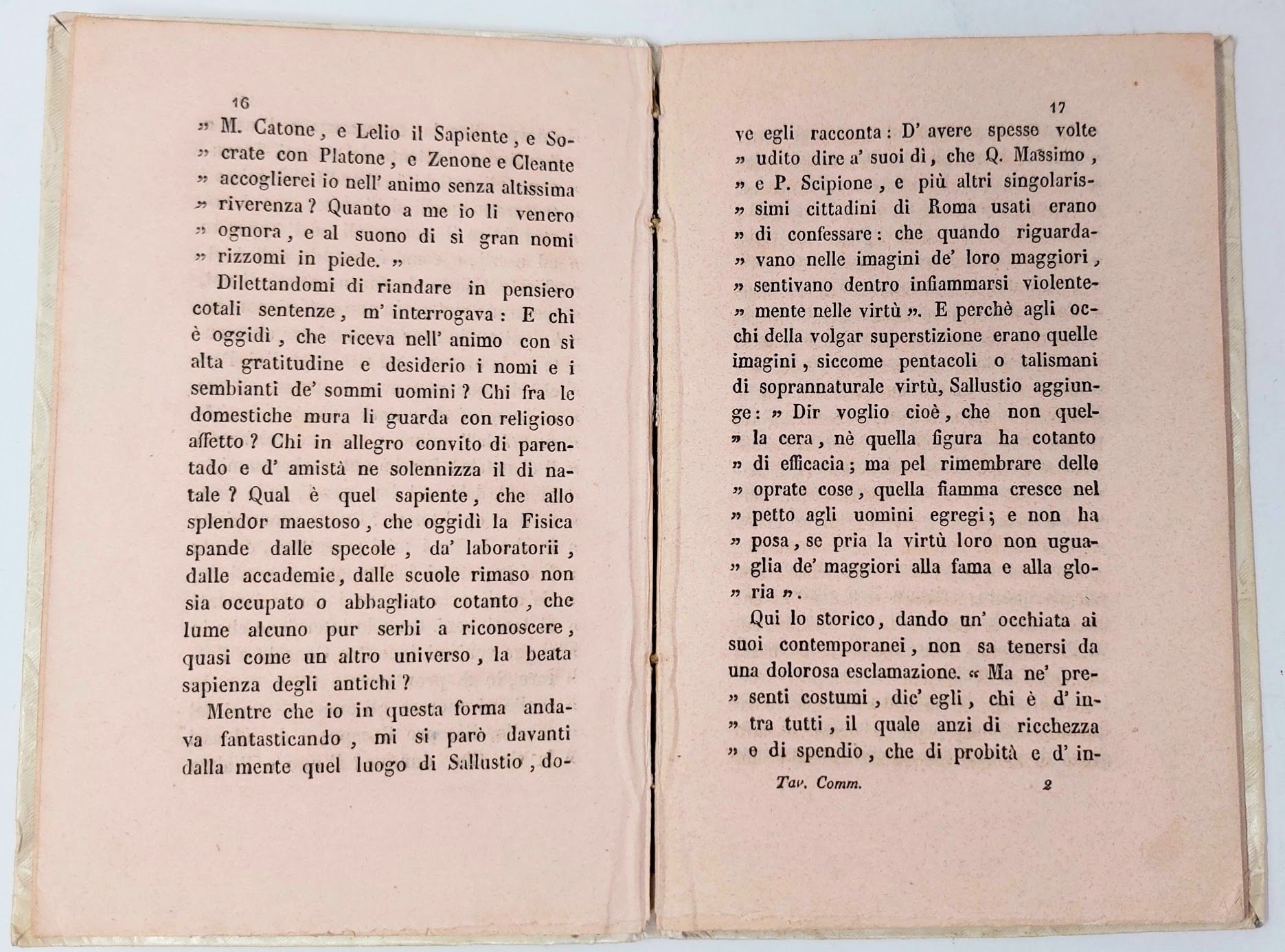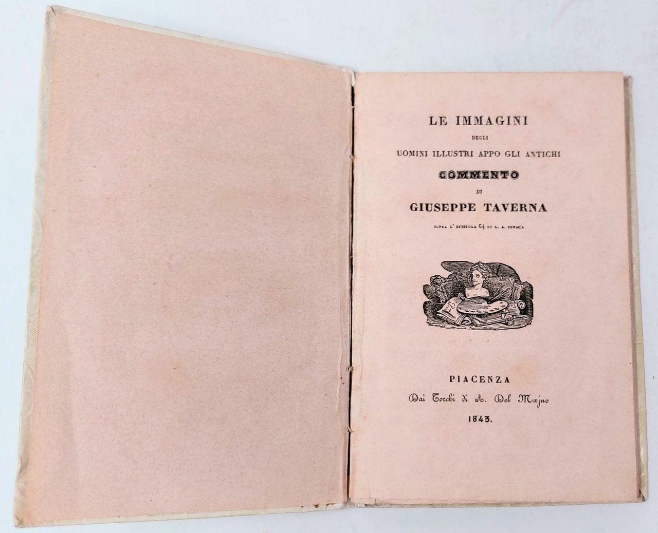 >in-12 (mm 160x100) pp. 89, (1), bella legatura in cartonato bianco con impressioni vegetali a secco. Sul piatto superiore figura la nota di provenienza manoscritta: "Biblioteca Famigliare del Conte Luigi Sanvitale". Giuseppe Taverna (Piacenza 1764-1890) celebre personaggio piacentino, studiò teologia al Collegio Alberoni dove divenne insegnante e poi direttore. Punto di riferimento per la pedagogia italiana: tra i suoi più illustri allievi figura anche il piacentino Pietro Giordani. Esemplare speciale impresso su carta rosa, ben conservato, intonso.