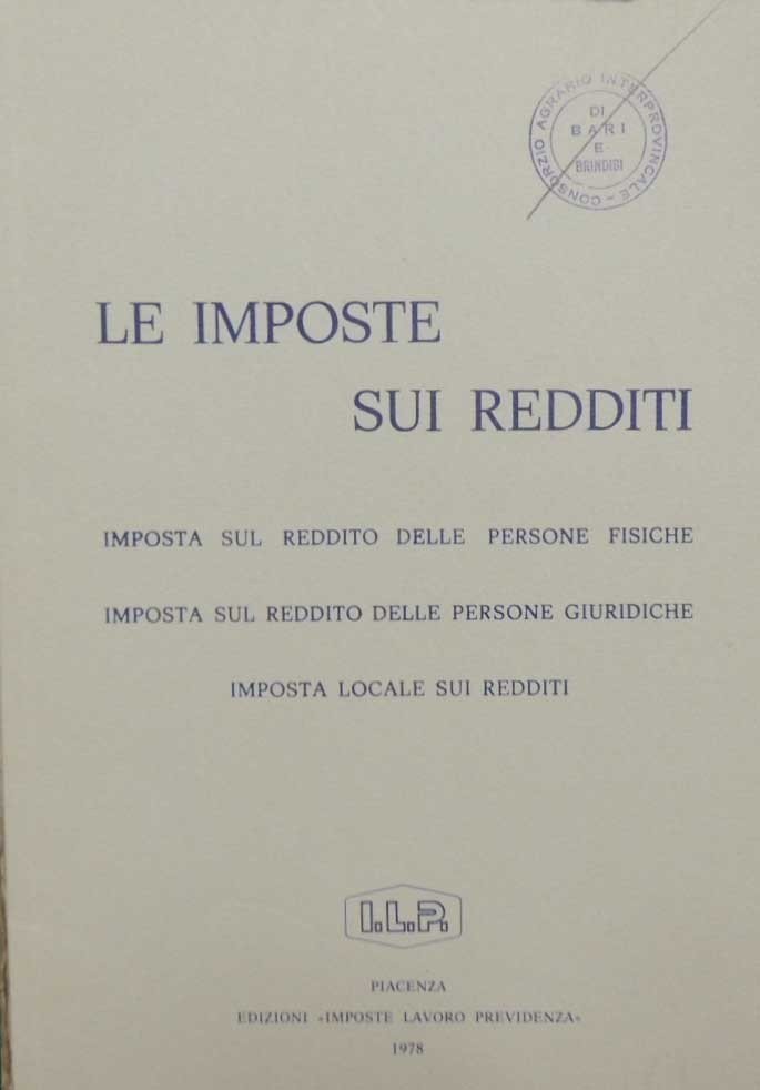 Le imposte sui redditi. Imposta sul reddito delle persone fisiche. Imposta sul reddito delle persone giuridiche. Imposta locale sui redditi, I.L.P. Edizioni Imposte Lavoro Previdenza, Piacenza 1978, pp. 110, cm 24, br. ed. Timbro di biblioteca estinta alla prima di copertina. Minima brunitura della carta, per il resto perfetto.