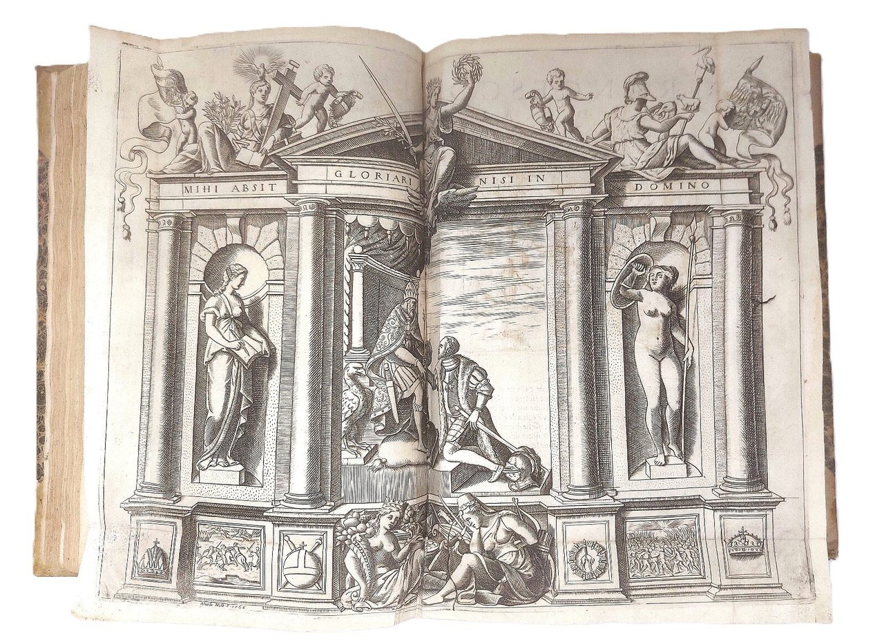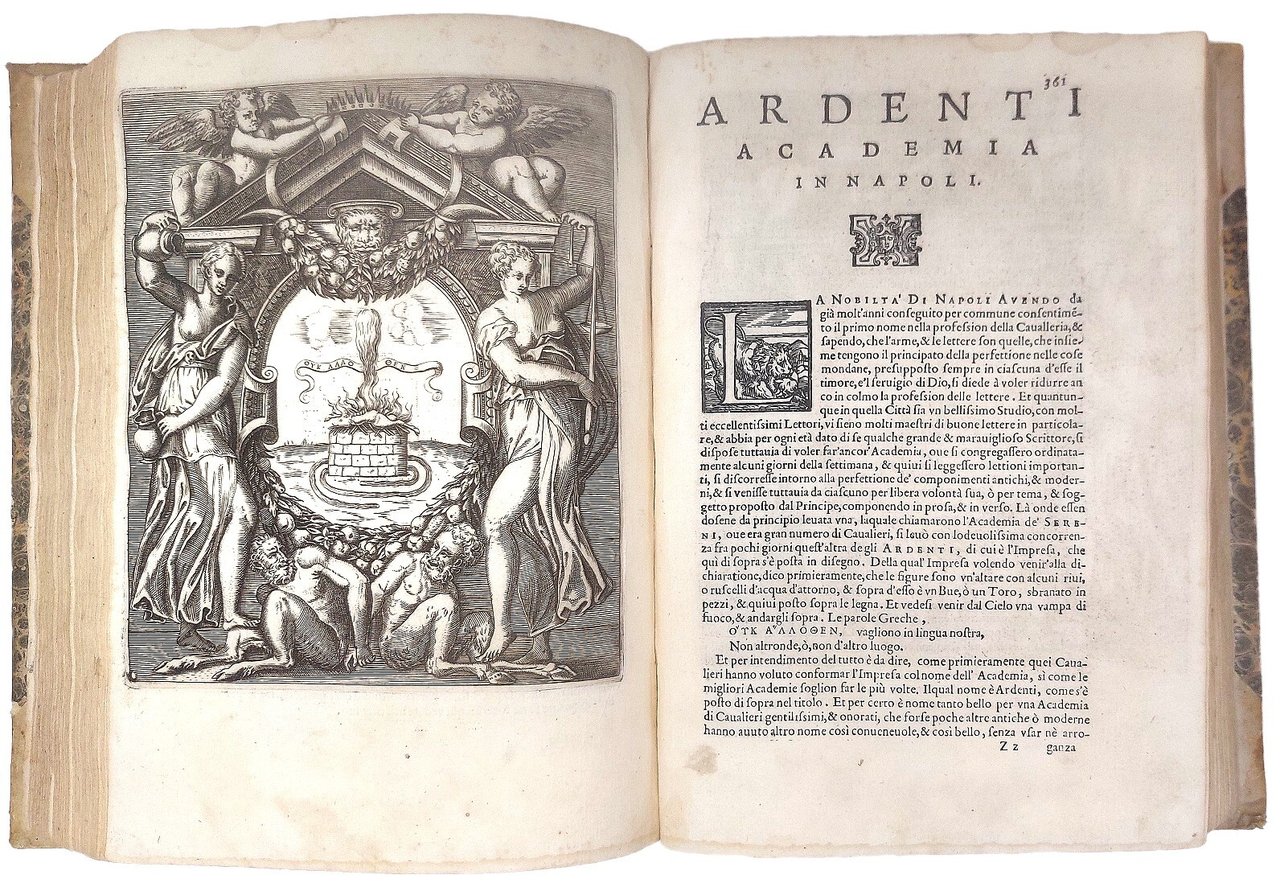 >4 parti in un vol. in-4 (245x170 mm), pp. (28), 496; 82. Legatura posteriore in mezza pergamena ed angoli, tassello con tit. oro al dorso. Frontespizio generale inciso da Giacomo Franco, altri tre titoli incisi per gli altri libri, 145 emblemi di varia grandezza, tra cui 2 a doppia pag. e molti a piena pag. La migliore e più completa edizione di uno dei più conosciuti e più importanti libri di emblemi del XVI secolo. Di notevole bellezza e fascino le incisioni che presentano una sorprendente varietà di soggetti (animali, uccelli, piante, sole, stelle, ecc.) in elaborate bordure. Gli emblemi a piena pagina sono di principi e personaggi più importanti, i più piccoli per quelli di minore rilievo; i due a piena pag. sono rispettivamente per Carlo V e Filippo II. Esemplare assai bello, tracce di antiche firme di possesso al frontespizio (lievi restauri nei margini bianchi di tre fogli; lievissime traccia d'umido sui primi ed ultimi ff.). Pwaz p.482. Vinet n.848.