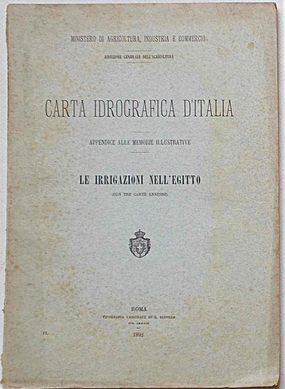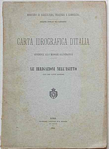 In 8° (cm. 26 x 18,5); pagg. 115; con 3 carte a due colori ripiegate f.t. (carta idrografica del Fayum, carta dell'Uadi Rayan, carta idrografica del Basso Egitto); brossura origin. VG. ** "A corredo delle memorie illustrative della carta idrografica del Regno, giova far conoscere in quale stato si trovino le irrigazioni nei paesi in cui queste sono più di pregio." L'Autore "visitò le principali opere costruite per l'irrigazione in quel paese, conobbe coloro che sono preposti alla manutenzione ed alla attuazione dei nuovi progetti e potè prender conoscenza."