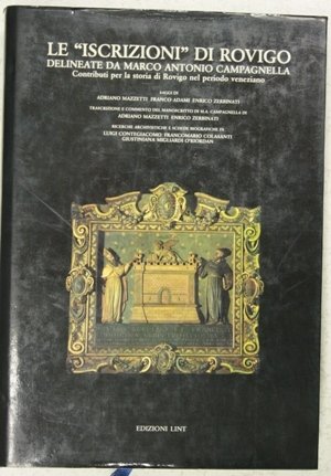 Bellissima opera: I^ edizione, rilegato in telaazzurra con sovracoperta illustrata; 575 pag in perfetto stato e ricco di illustrazioni. LE ISCRIZIONI DI ROVIGO: DELINEATE DA MARCO ANTONIO CAMPAGNELLA. CONTRIBUTI PER LA STORIA DI ROVIGO NEL PERIODO VENEZIANO. Saggi di Adriano Mazzetti, Franco Adami, Enrico Zerbinati ; trascrizione e commento del manoscritto di M. A. Campagnella di Adriano Mazzetti, Enrico Zerbinati ; ricerche archivistiche e schede biografiche: Luigi Contegiacomo, Francomario Colasanti, Giustiniana Migliardi O'Riordan.