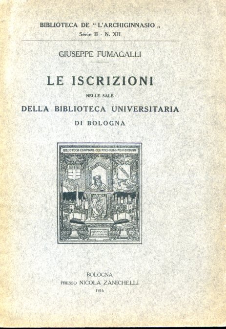 In-8°, pp. 40, (3), brossura editoriale grigia con vignetta xilografica allegorica dell'Università di Bologna, 'Alma Mater Studiorum'. Marca tipografica al titolo, testatine e capilettera ornati. Bell'esemplare. Estratto da 'L'Archiginnasio'. Biblioteca de 'L'Archiginnasio', serie II, n. XII. Interessante contributo di epigrafia felsinea, consistente nella sistematica illustrazione delle iscrizioni presenti nelle sale della Biblioteca dell'Università.