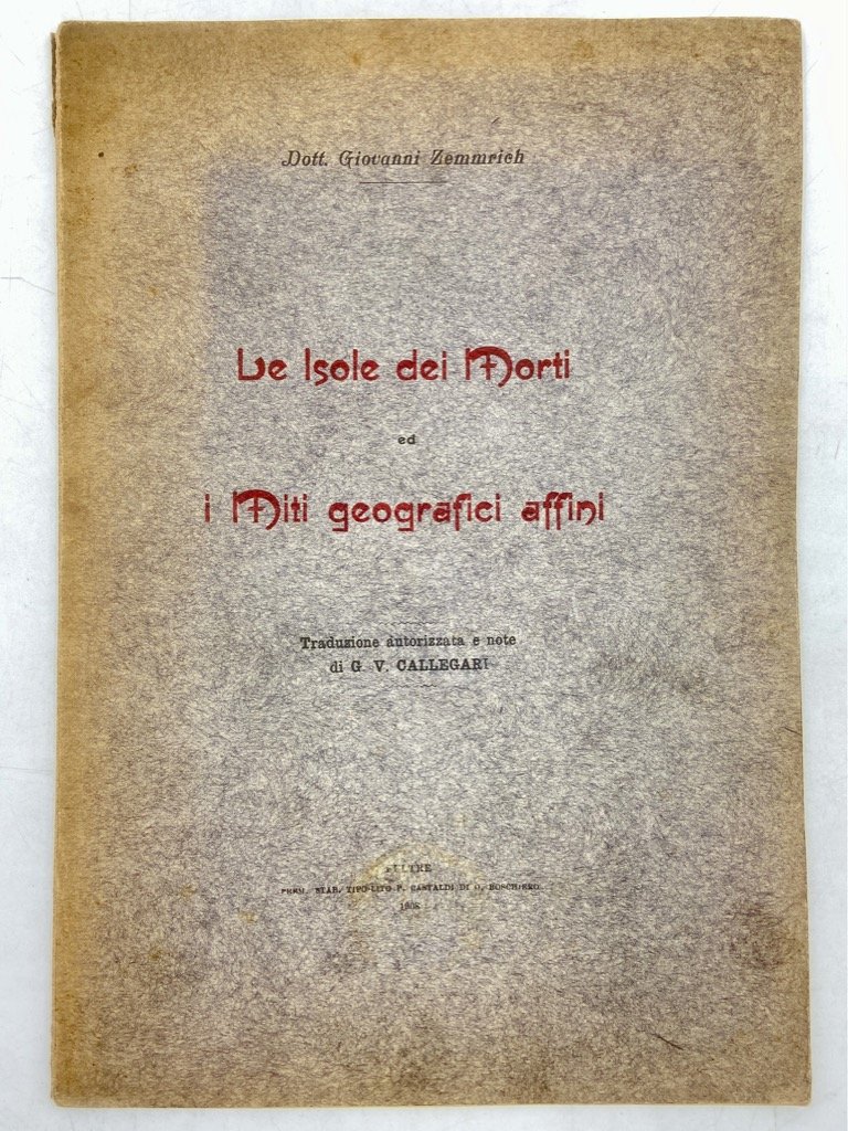 Brossura editoriale a stampa (piccoli difetti alle estremità del dorso, mancanza di circa un centimetro su un angolo del piatto posteriore), in ottavo cm 24.5 x 17, pp 63 (1). Prima e unica versione italiana di questo studio comparatistico sui miti delle terre dei morti, i Campi Elisi ecc, apparso all’origine sulle pagine dell’Internationales Archiv für Ethnographie nel 1891; l’ultimo capitolo riguarda Atlantide. L’edizione italiana, con introduzione e note, è curata da Guido Valeriano Callegari (Parma 1876 - Coredo 1954), studioso e folklorista che fu tra i primi in Italia ad occuparsi delle culture precolombiane e pubblicò numerosi interventi sul problema dell’aldilà e della morte, tanto dal punto di vista scientifico quanto nella storia delle culture umane. Non comune.