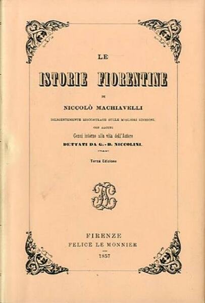 Ristampa anastatica dell'edizione del 1857. XXX, 452 p. ; 18 x 12 cm. «Le Istorie fiorentine», concepite e scritte nella prima metà degli anni Venti del Cinquecento, sono l’ultima grande opera, in ordine di tempo, di Machiavelli. Esse furono occasionate, per così dire, da fattori esterni (l’opera fu commissionata dal cardinale Giulio de’ Medici, il futuro papa Clemente VII), ma è possibile rinvenire in Machiavelli qualche antecedente ‘storiografico’, anche se mai tradottosi in un’opera compiuta. Ristampa anastatica della terza edizione del 1857. Legatura editoriale, coperta in cartone rigido telato di colore grigio, titolo impresso al piatto e al dorso. Sovraccoperta in carta, custodia editoriale cartonata. Libro integro. Codice libreria 6368.