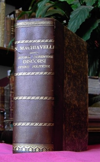Volume in 8 piccolo legato in mezza pelle (qualche crepa e piccola laerazione), titolo inciso in oro al dorso, sguardie, frontespizio, 452 pp., frontespizio dei Discorsi, 345 pp., occhiello e frontespizio del Principe, LXI, bianca, occhiello, 176 pp. Le opere politiche e storiche del grande Fiorentino nell'accurata edizione del Le Monnier, in belle condizioni. Superfluo accennare a tale Autore universale. Lievi mende al dorso. Non comune.
