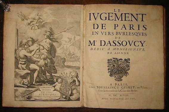 4to (cm. 22,5), 14 cc.nn. (comprese due tavv. incise su rame), 92 pp., 2 cc.nn. Legatura coeva in piena pelle con doppio filo oro ai piatti, nervi, fregi e titolo oro al ds. Testatine, finalini e iniziali figurate. Legatura con tracce di usura, bruniture della carta, ma buon esemplare nel complesso. Prima edizione. Contiene versi inediti di l’Abbé Scarron, di Tristan Lhermite, di Pelletier, ecc. Raro.