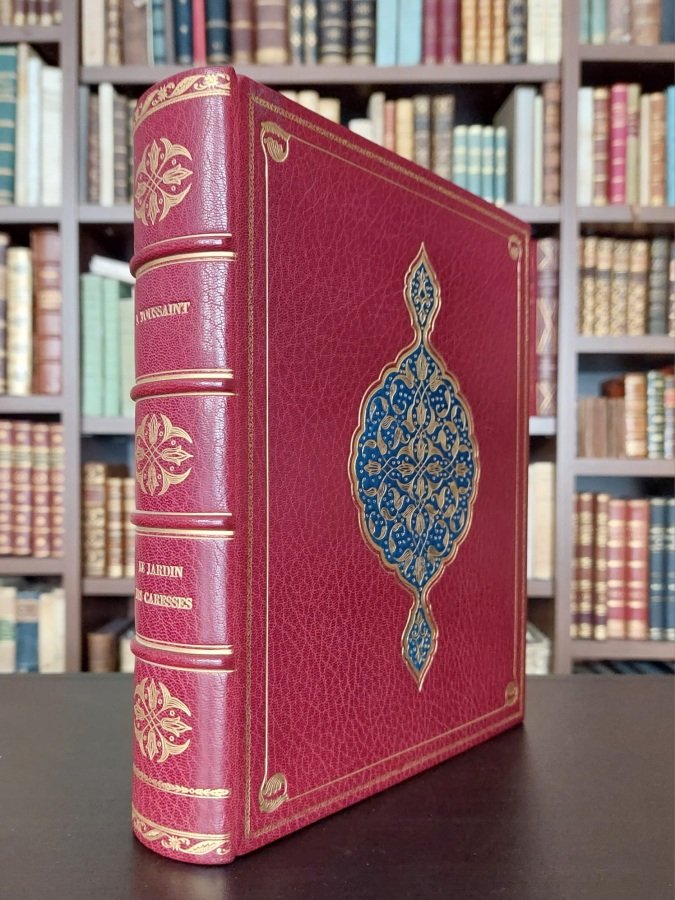 <span style="font-style: normal;">In-8° (cm. 23,5), legatura persianeggiante eseguita da Mario Rigoldi (non firmata) in pieno marocchino rosso, al centro dei piatti motivo decorativo a mandorla caudata in oro mosaicato in blu riempito di fiori di loto, foglie e puntini in oro e inquadrato da due cornici sempre in oro, al dorso titolo e fregi in oro, taglio superiore dorato; </span><i>dentelles</i><span style="font-style: normal;"> e </span><i>doublure</i><span style="font-style: normal;"> in velluto blu, conservata la brossura editoriale. Esemplare n. 118 degli speciali 88 con in fine le numerose pagine di scomposizione dei colori di un'illustrazione; pp. 137 [107] su carta greve </span><i>Vélin de Rives</i> in ottimo stato. Superbo esemplare custodito in cofanetto marmorizzato. [L]