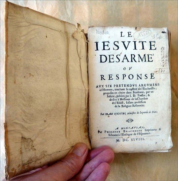 Un volume de format petit in 8° de 12 pp. (titre, adresse aux gens du Roy, approbations de différents Pasteurs de l'Eglise Réformée, errata); 224 pp.; 1 p.bl. Reliure muette de l'époque en plein parchemin . Très rare ouvrage du au Pasteur Jean Ricotie,r d'une famille proche des académies protestantes de Montauban, Bergerac, Bordeaux. Manque de parchemin à la reliure; volume partiellement débroché; manque angulaire avec petit manque de texte à la page 1; sinon bien complet. Travail de vers en marges; mouillures claires. En l'état. A restaurer. Voir les photos.