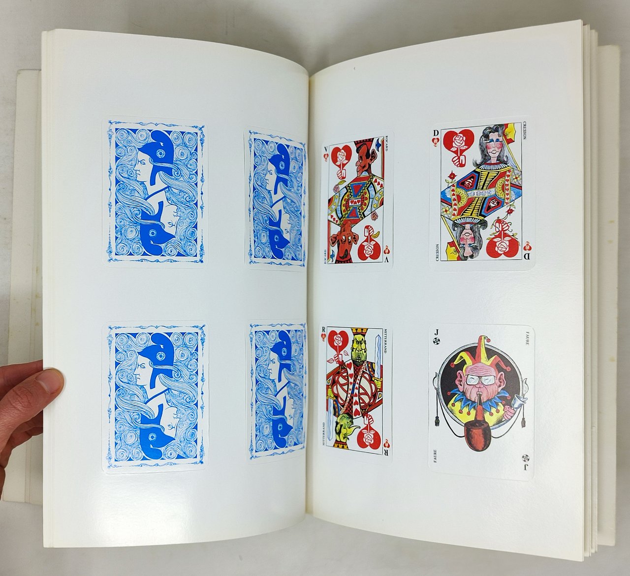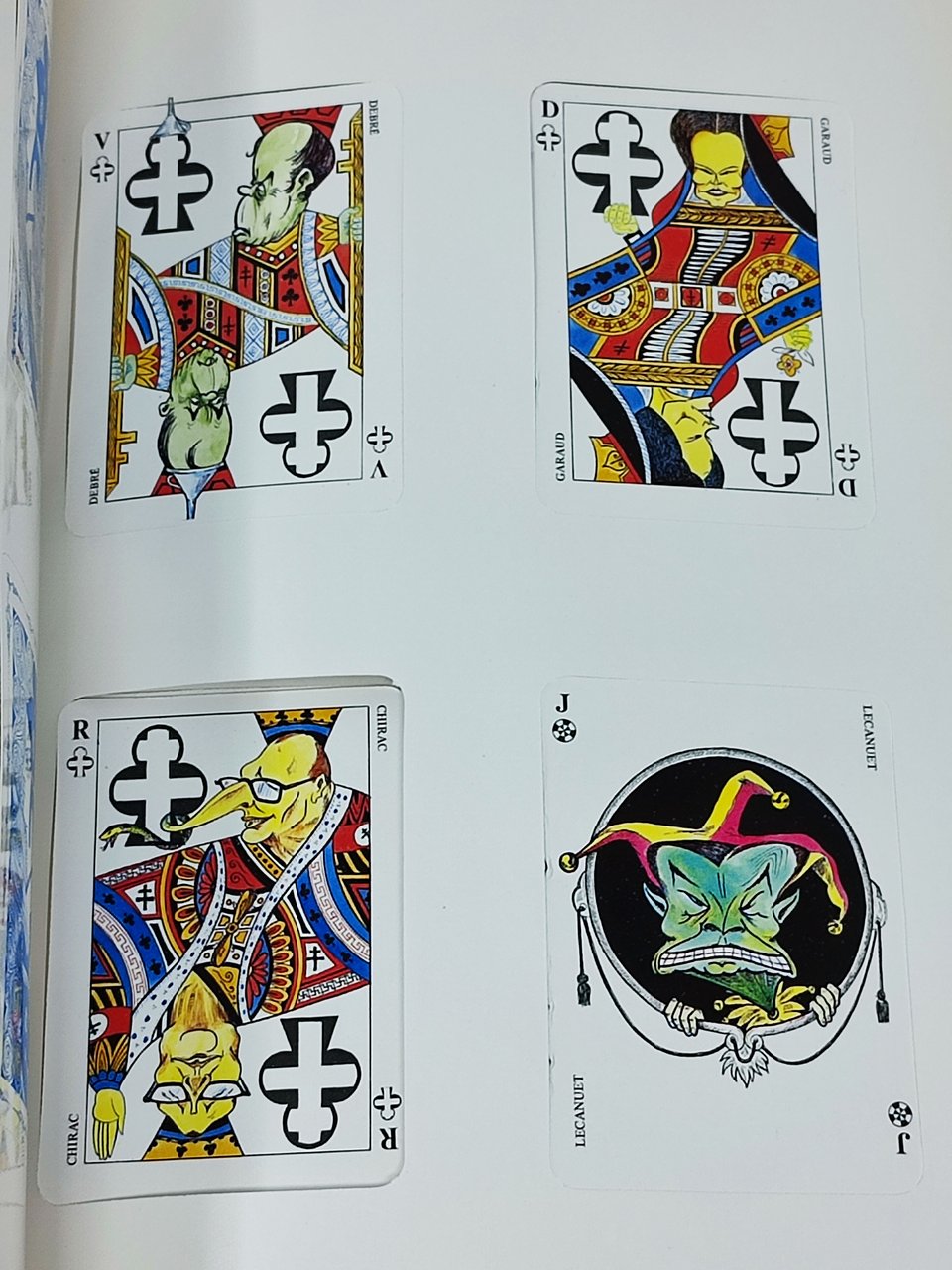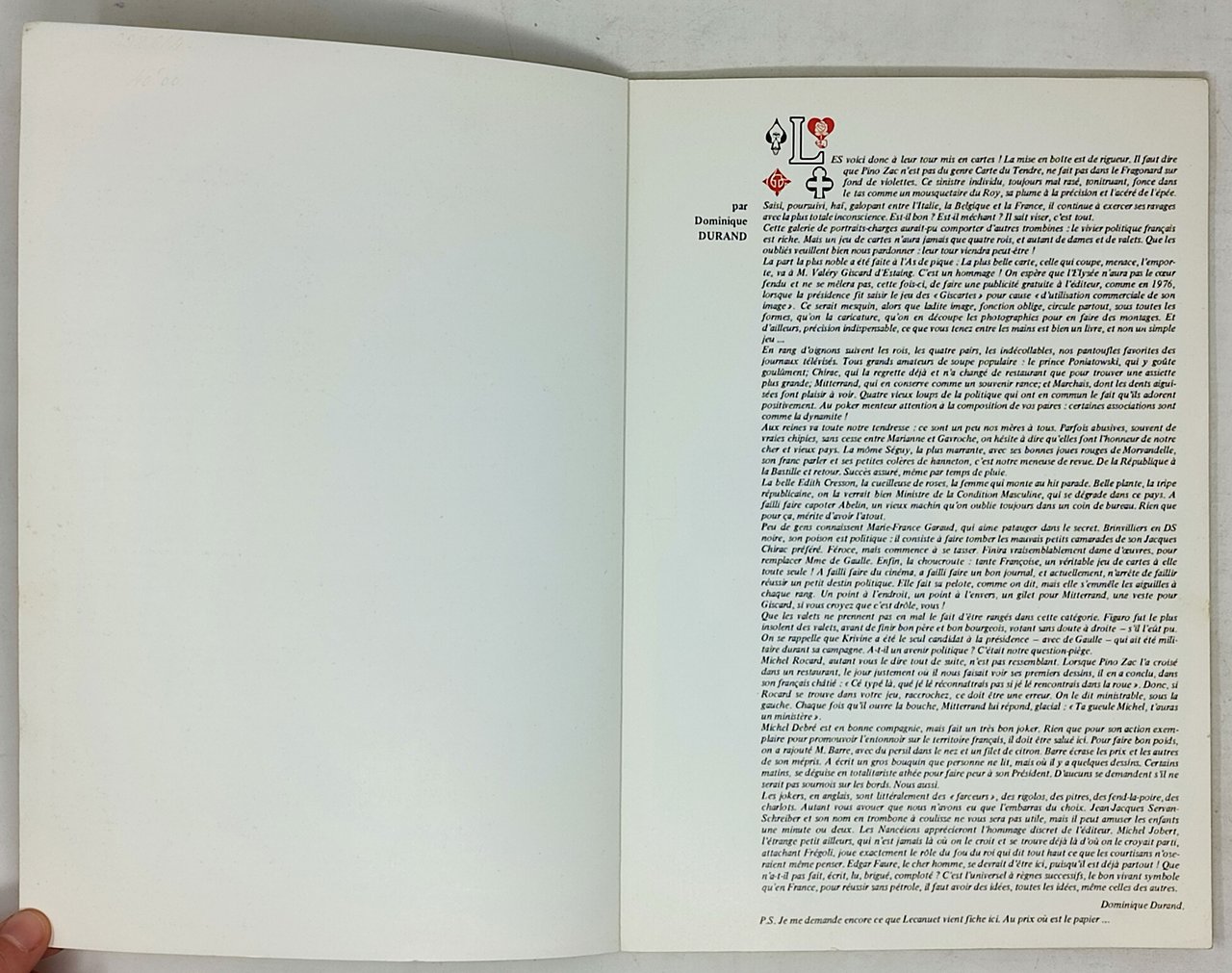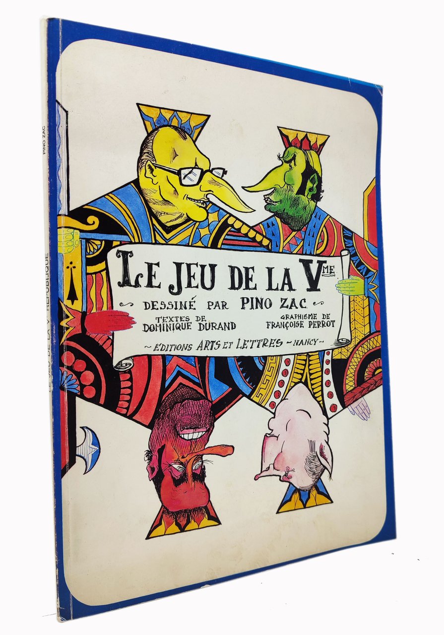 Volume satirico, di dimensioni 21 x 30 cm circa, nel quale sono raccolte 56 carte da gioco e il relativo pacchetto (da 'montare'), illustrate dal celebre fumettista Pino Zac (Giuseppe Zaccaria). Ogni pagina del volume propone 4 carte da gioco (con protagonisti personaggi politici dell'epoca) che possono essere staccate dalla pagina (una volta staccate non possono più essere inserite all'interno del libro) per poi essere conservate nel loro pacchetto. Textes de Dominique Durans. Graphisme de Francoise Perrot. Testo in lingua francese. Imprimerie STAR (Saint Nicolas De Port). Stato di conservazione: qualche piccolo ingiallimento e leggero alone sulla copertina posteriore, minuscole pieghette sul piatto anteriore ma, nel complesso, un esemplare decisamente ben conservato. Carte mai staccate e in ottimo stato conservativo. Opera di non facile reperimento.