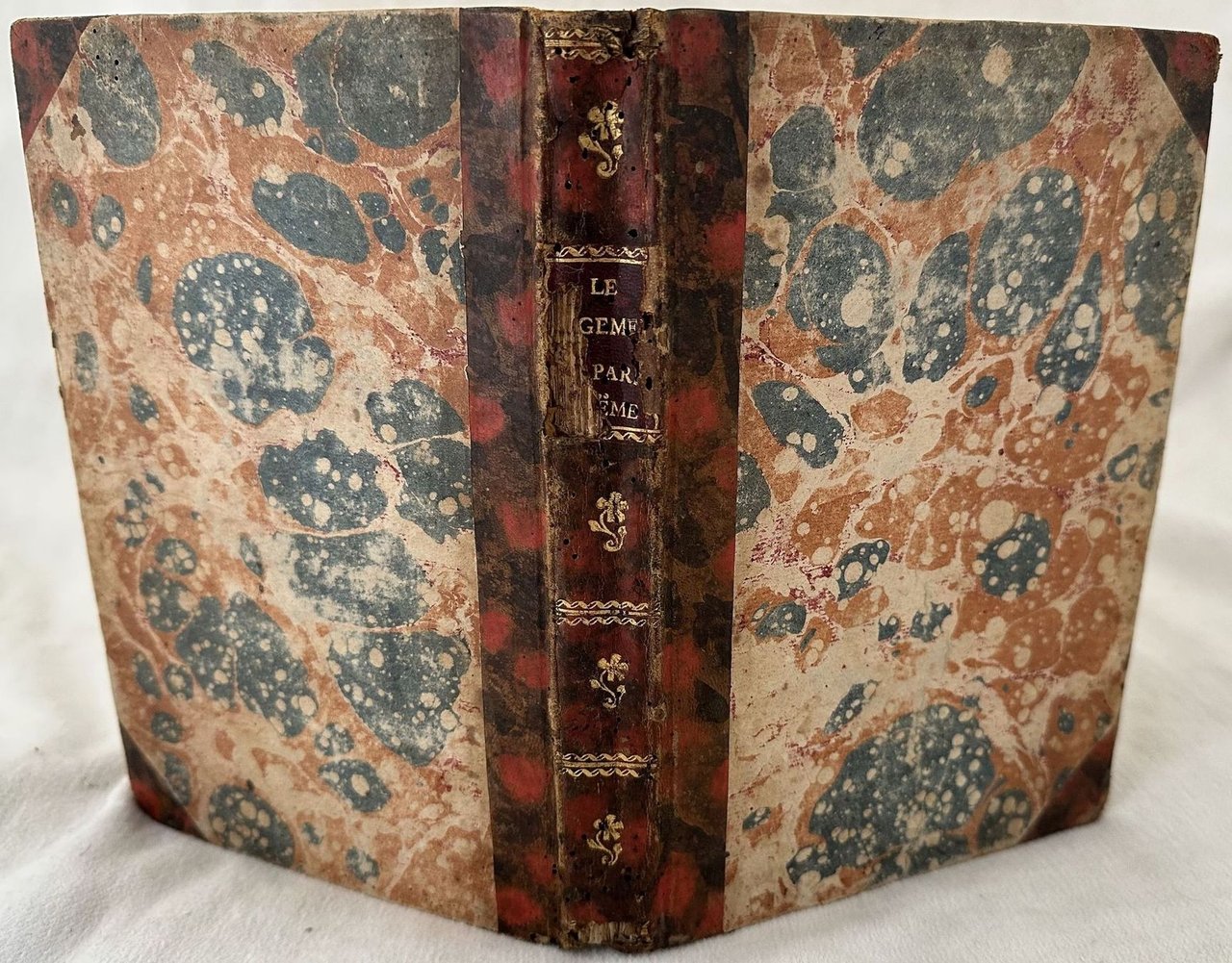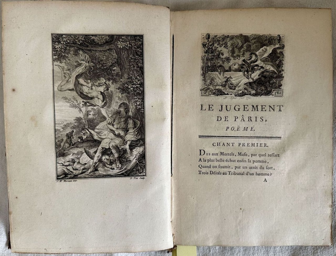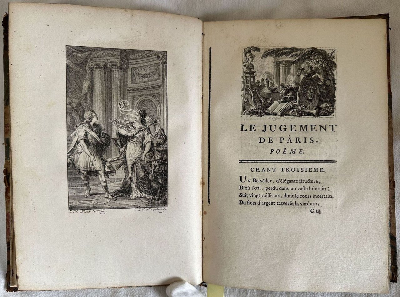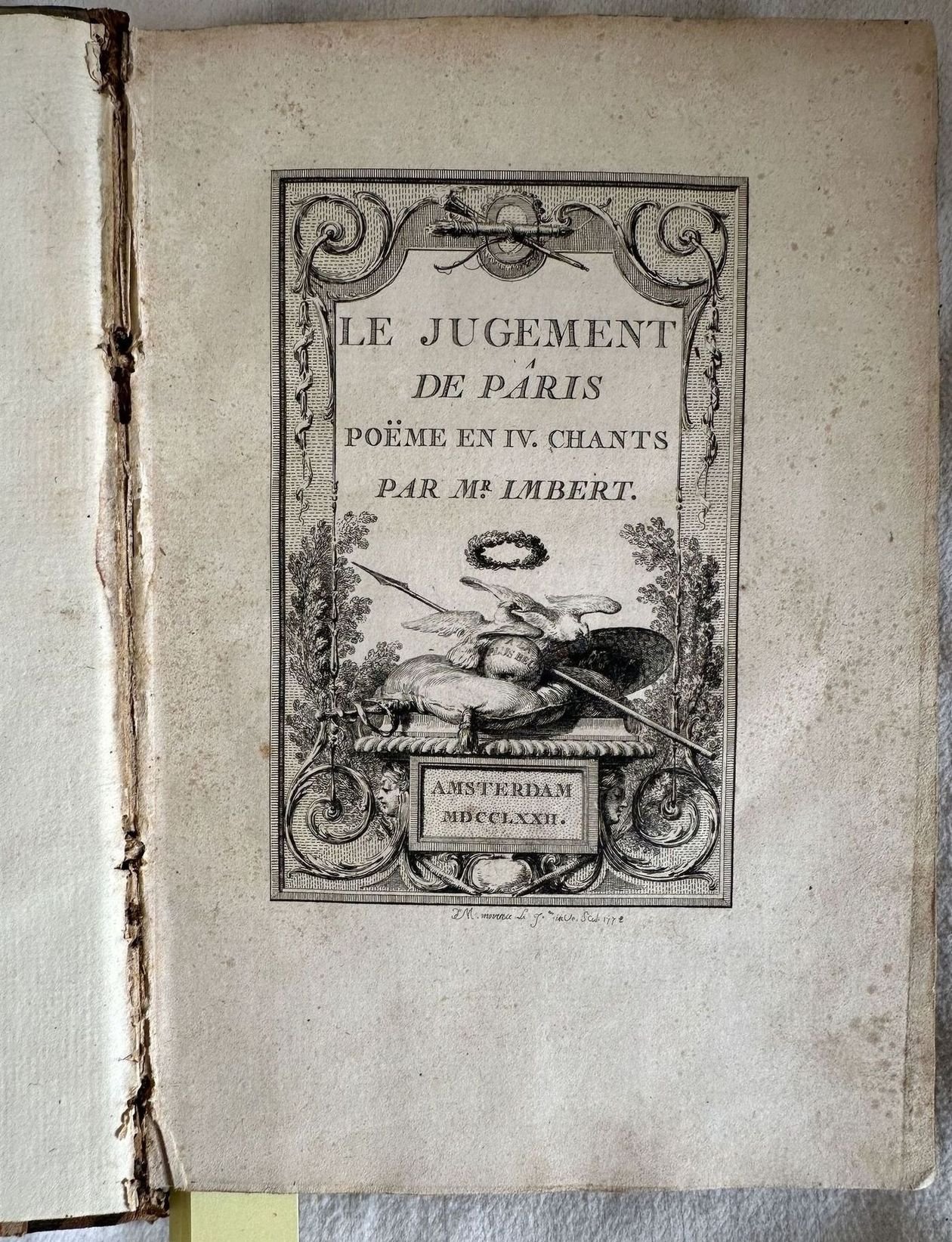 Edizione del 1772, in parte originale e la più ricercata di questa celebre opera poetica di Barthelemy Imbert (1747-1790). Viene indicata Amsterdam come luogo di stampa ma in realtà è Parigi. Il testo è impreziosito da quattro finissime incisioni fuori testo di vari autori (Duclos, Masquelier, Nèe, N. de Launay) su disegno di Moreau le Jeune e quattro testatine incise da Pierre Philippe Choffard (1731-1809) nel 1772. Frontespizio inciso da Moreau le Jeune. Tagli marmorizzati. In buone condizioni. Copertina in mezza pelle coeva con titolo in oro al dorso in buone condizioni generali con lievi usure ai margini e dorso. Legatura in buone condizioni. Le pagine 103 e 105 staccate dalla legatura ma presenti. All'interno le pagine si presentano in buone condizioni con rare fioriture. Qualche marginale segno di antico inchiostro. In 8. Dim. 21,5x15 cm. Pp. (1)+VIII+200.Edition of 1772, in part original and the most appreciated poetical work by Barthelemy Imbert (1747-1790). The place of printing is indicated as Amsterdam but is Paris in reality. the text is enriched by four very fine out of text plates of different authors (Duclos, Masquelier, Nèe, N. de Launay) after Moreau le Jeune and four vignettes engraved by Pierre Philippe Choffard (1731-1809) in 1772. Title page engraved by Moreau le Jeune. Marbled external edges of pages. In good conditions. half leather coeval cover with gilted title in the spine in good general conditions lightly worn in the extremities. Binding in good conditions. Pages 103 and 105 are detached from binding. Inside pages are in good conditions with occasional foxing. Some sign of antique ink stain. In 8. Dim. 21,5x15 cm. Pp. (1)+VIII+200.<BR><BR>