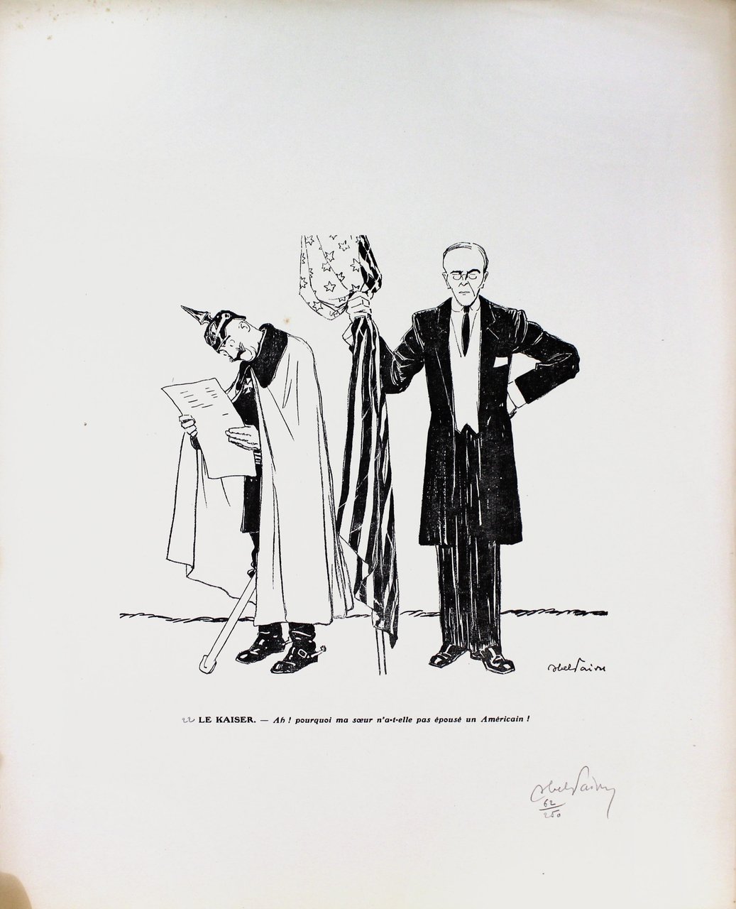 Abel Jules Faivre (Lione 1867 - Nizza 1945) Litografia originale firmata a mano dall'artista.Dimensioni: 56 x 38,5 cmCon certificato di autenticità C.O.A.Ingiallimento laterale come da foto.Esemplare numero 62/250 La raccolta di litografie umoristiche del caricaturista francese Abel Faivre (Lione 1867-Nizza 1945), andata a confluire nel volume Jours de guerre,fu pubblicata in due tomi tra il 1915 e il 1919. Con il procedere del conflitto, l'opinione pubblica di tutti i paesi coinvolti,che aveva dapprima affrontato tale evento con ottimismo, mutò rapidamente opinione sino a considerare la guerra, senza mezzi termini,come un avvenimento rovinoso. In tale contesto, le vignette satiriche di guerra possedevano un potente effetto catartico,adempivano un ruolo sociale irrinunciabile, fornendo una valvola di sfogo all’incombere dal più cupo pessimismo. Abel Jules Faivre (Lyon 1867 - Nizza 1945) Originale Lithographie vom Künstler von Hand signiert.Abmessungen: 56 x 38,5 cmMit Echtheitszertifikat C.O.A.Seitliche Vergilbung wie auf dem Foto.Kopieren Sie die Nummer 62/250 Die Sammlung humorvoller Lithographien des französischen Karikaturisten Abel Faivre (Lyon 1867-Nizza 1945), die in den Band Jours de guerre floss,es wurde zwischen 1915 und 1919 in zwei Bänden veröffentlicht. Im Verlauf des Konflikts wurde die öffentliche Meinung in allen beteiligten LändernWer dieses Ereignis anfangs mit Optimismus konfrontiert hatte, änderte schnell seine Meinung, um den Krieg ohne Zweifel zu betrachten.wie ein ruinöses Ereignis. In diesem Zusammenhang hatten die satirischen Kriegskarikaturen eine starke kathartische Wirkung.Sie erfüllten eine unverzichtbare soziale Rolle und bildeten ein Entlastungsventil gegen den dunkelsten Pessimismus. Abel Jules Faivre (Lyon 1867 - Nice 1945) Lithographie originale signée à la main par l'artiste.Dimensions: 56 x 38,5 cmAvec certificat d'authenticité C.O.A.Jaunissement latéral comme sur la photo.Copie numéro 62/250 La collection de lithographies humoristiques du caricaturiste français Abel Faivre (Lyon 1867-Nice 1945), qui allait se fondre dans le volume Jours de guerre,il a été publié en deux volumes entre 1915 et 1919. À mesure que le conflit progressait, l'opinion publique de tous les pays impliqués,qui avait d'abord fait face à cet événement avec optimisme, a rapidement changé d'avis pour envisager la guerre, en termes non équivoques,comme un événement ruineux. Dans ce contexte, les caricatures de guerre satiriques ont eu un puissant effet cathartique,ils remplissaient un rôle social indispensable, fournissant une soupape de décharge du pessimisme le plus sombre. Abel Jules Faivre (Lyon 1867 - Nice 1945) Original lithograph signed by hand by the artist.Dimensions: 56 x 38.5 cmWith certificate of authenticity C.O.A.Lateral yellowing as in the photo.Copy number 62/250 The collection of humorous lithographs by the French caricaturist Abel Faivre (Lyon 1867-Nice 1945), which went to flow into the volume Jours de guerre,it was published in two volumes between 1915 and 1919. As the conflict progressed, public opinion in all the countries involved,who had initially faced this event with optimism, quickly changed his opinion to consider the war, in no uncertain terms,like a ruinous event. In this context, the satirical war cartoons had a powerful cathartic effect,they fulfilled an indispensable social role, providing a relief valve from the darkest pessimism.