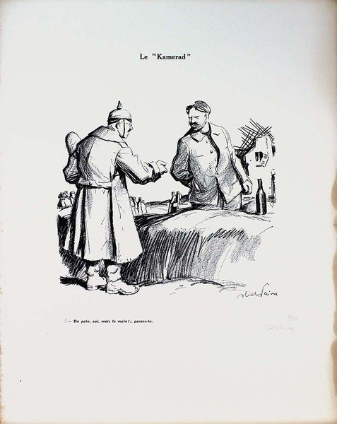 Abel Jules Faivre (Lione 1867 - Nizza 1945) Litografia originale firmata a mano dall'artista.Dimensioni: 56 x 38,5 cmCon certificato di autenticità C.O.A.Ingiallimento laterale come da foto.Esemplare numero 62/250 La raccolta di litografie umoristiche del caricaturista francese Abel Faivre (Lione 1867-Nizza 1945), andata a confluire nel volume Jours de guerre,fu pubblicata in due tomi tra il 1915 e il 1919. Con il procedere del conflitto, l'opinione pubblica di tutti i paesi coinvolti,che aveva dapprima affrontato tale evento con ottimismo, mutò rapidamente opinione sino a considerare la guerra, senza mezzi termini,come un avvenimento rovinoso. In tale contesto, le vignette satiriche di guerra possedevano un potente effetto catartico,adempivano un ruolo sociale irrinunciabile, fornendo una valvola di sfogo all’incombere dal più cupo pessimismo. Abel Jules Faivre (Lyon 1867 - Nizza 1945) Originale Lithographie vom Künstler von Hand signiert.Abmessungen: 56 x 38,5 cmMit Echtheitszertifikat C.O.A.Seitliche Vergilbung wie auf dem Foto.Kopieren Sie die Nummer 62/250 Die Sammlung humorvoller Lithographien des französischen Karikaturisten Abel Faivre (Lyon 1867-Nizza 1945), die in den Band Jours de guerre floss,es wurde zwischen 1915 und 1919 in zwei Bänden veröffentlicht. Im Verlauf des Konflikts wurde die öffentliche Meinung in allen beteiligten LändernWer dieses Ereignis anfangs mit Optimismus konfrontiert hatte, änderte schnell seine Meinung, um den Krieg ohne Zweifel zu betrachten.wie ein ruinöses Ereignis. In diesem Zusammenhang hatten die satirischen Kriegskarikaturen eine starke kathartische Wirkung.Sie erfüllten eine unverzichtbare soziale Rolle und bildeten ein Entlastungsventil gegen den dunkelsten Pessimismus. Abel Jules Faivre (Lyon 1867 - Nice 1945) Lithographie originale signée à la main par l'artiste.Dimensions: 56 x 38,5 cmAvec certificat d'authenticité C.O.A.Jaunissement latéral comme sur la photo.Copie numéro 62/250 La collection de lithographies humoristiques du caricaturiste français Abel Faivre (Lyon 1867-Nice 1945), qui allait se fondre dans le volume Jours de guerre,il a été publié en deux volumes entre 1915 et 1919. À mesure que le conflit progressait, l'opinion publique de tous les pays impliqués,qui avait d'abord fait face à cet événement avec optimisme, a rapidement changé d'avis pour envisager la guerre, en termes non équivoques,comme un événement ruineux. Dans ce contexte, les caricatures de guerre satiriques ont eu un puissant effet cathartique,ils remplissaient un rôle social indispensable, fournissant une soupape de décharge du pessimisme le plus sombre. Abel Jules Faivre (Lyon 1867 - Nice 1945) Original lithograph signed by hand by the artist.Dimensions: 56 x 38.5 cmWith certificate of authenticity C.O.A.Lateral yellowing as in the photo.Copy number 62/250 The collection of humorous lithographs by the French caricaturist Abel Faivre (Lyon 1867-Nice 1945), which went to flow into the volume Jours de guerre,it was published in two volumes between 1915 and 1919. As the conflict progressed, public opinion in all the countries involved,who had initially faced this event with optimism, quickly changed his opinion to consider the war, in no uncertain terms,like a ruinous event. In this context, the satirical war cartoons had a powerful cathartic effect,they fulfilled an indispensable social role, providing a relief valve from the darkest pessimism.