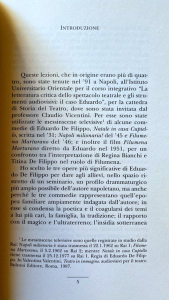 Queste lezioni, che in origine erano più di quattro, sono state tenute nel '91 a Napoli, all'Istituto Universitario Orientale per il corso integrativo “La letteratura critica dello spettacolo teatrale e gli strumenti audiovisivi: il caso Eduardo", per la cattedra di Storia del Teatro, dove sono stata invitata dal professore Claudio Vicentini. Per esse sono state utilizzate le messinscene televisive di alcune com medie di Eduardo De Filippo, Natale in casa Cupiello, scritta nel '31; Napoli milionaria! del '45 e Filumena Marturano del '46; e inoltre il film Filumena Marturano diretto da Eduardo nel 1951, per un confronto tra l'interpretazione di Regina Bianchi e Titina De Filippo nel ruolo di Filumena.