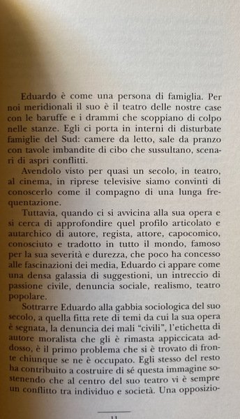 Da qui il tentativo di "leggere" Eduardo come un autore contemporaneo, scartando e sottraendo le letture sociologiche e moralistiche - operazione certamente già condotta da altri studiosi nell'ultimo decennio - e individuando le linee più sintomatiche della sua modernità: dall'universo simbolico e dalle numerose suggestioni sotterranee alla costruzione di sapienti macchine teatrali ad uso del pubblico il quale è un elemento precipuo della sua scrittura drammaturgica.