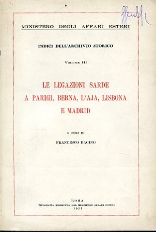 In-8°, pp. 105, brossura editoriale. Due firme di possesso. Ottimo stato. Prima edizione. 'Vengono editi in un solo volume gli indici concernenti le scritture delle rappresentanze sarde a Parigi, Berna, l'Aja, Lisbona e Madrid, per il cui ordinamento sono stati seguiti i criteri che hanno sin qui ispirato l'inventariazione degli altri fondi archivistici relativi alle legazioni sarde, conservati presso l'Archivio Storico del Ministero degli Affari Esteri'.