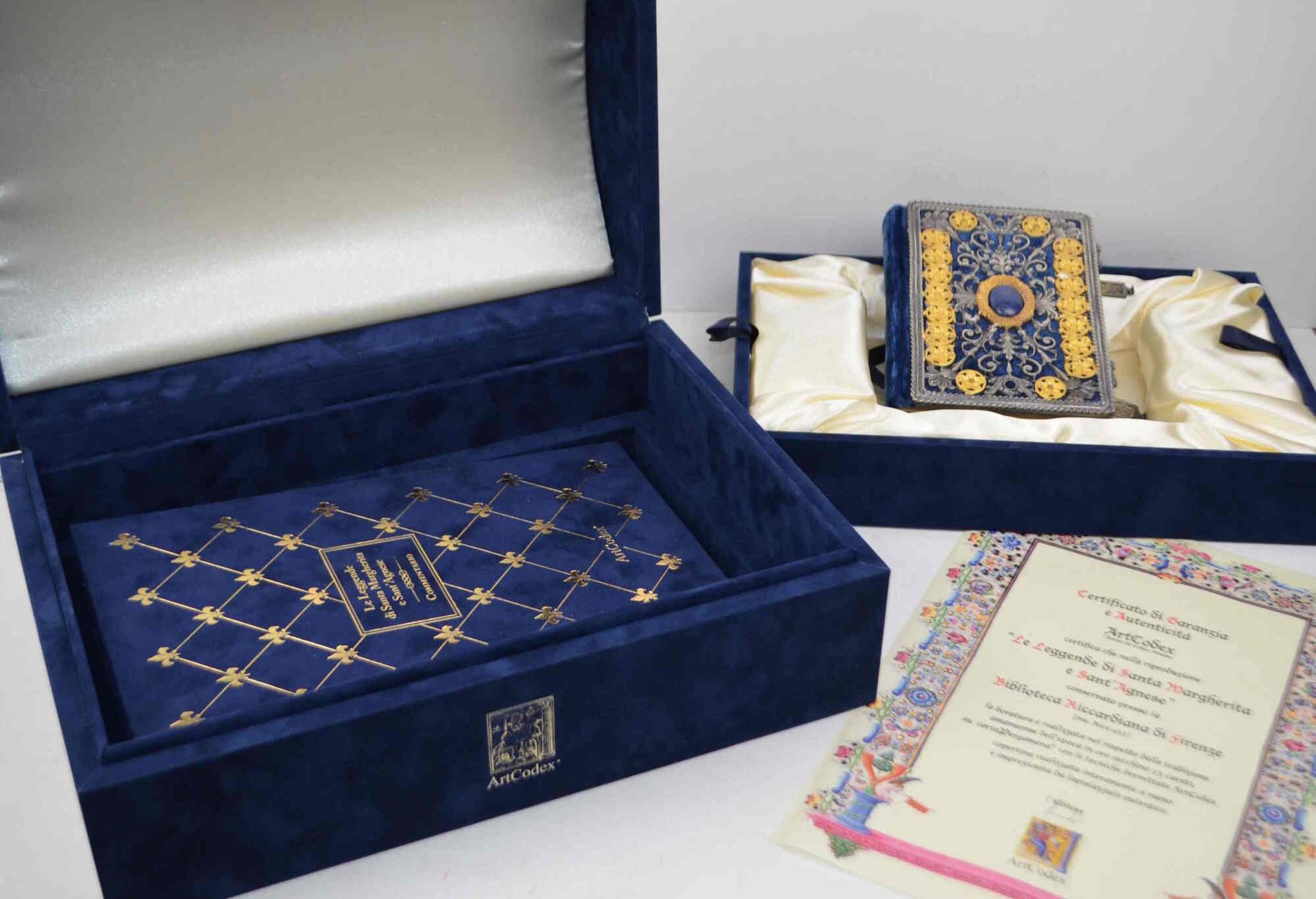 Cm. 15, cc. 61. Con 33 miniature. Sontuosa legatura in velluto con piatti riccamente decorati in rilievo e con fermagli di chiusura. Insieme ad un volume di commento. I due volumi entro cofanetto originale. Perfetta conservazione, in stato di nuovo. Edizione impressa in 999 esemplari numerati a mano (ns. n. 302). Bella ristampa in facsimile del manoscritto conservato presso la Biblioteca Riccardiana di Firenze.