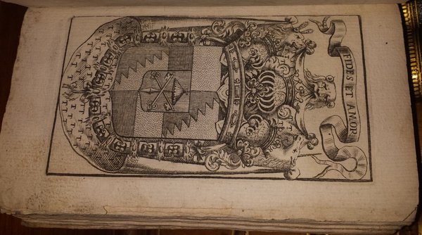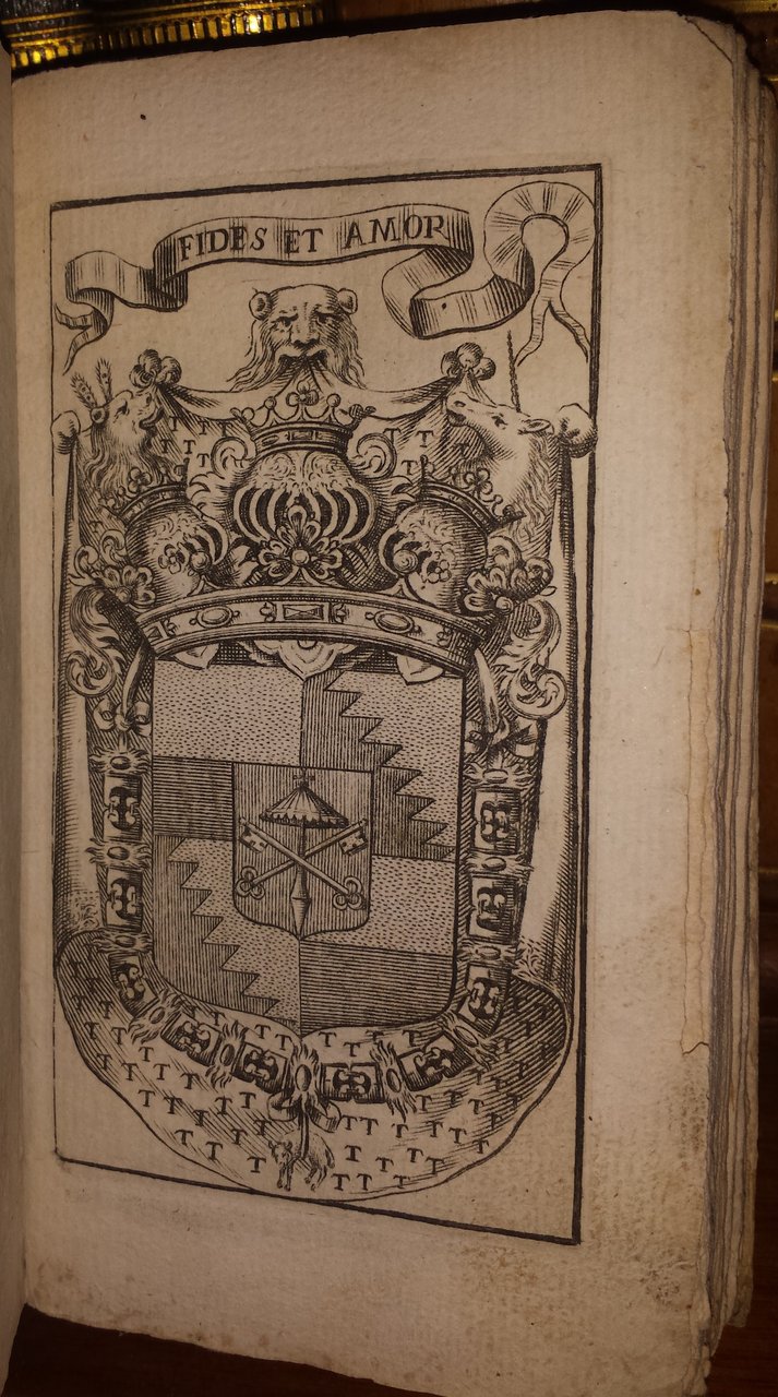 In-12 (15,5 cm) (2) c. di tav. (antiporta e occhiello) (54) 188 (40) c. di tav. (6). Occhiello pienamente inciso raffigurante armi con le diciture "virtute tantum" e "Le Leggi del Blasone", in basso "Agnelli sculp." Antiporta inciso a piena pagina con numerosi simboli araldici e la scritta "Fides et Amor". "Parte prima" cancellato al frontespizio. La seconda parte dell'opera sembra non sia mai stata pubblicata. Cartoncino rustico coevo con custodia moderna in cartoncino marmorizzato. Dedica al Sig. Conte Trotti con sonetto; avvertenze ai lettori; "indice dei trattati contenuti in questa prima parte", "Dell'origine dell'arme", "In quale paese le Arme hanno cominciato".