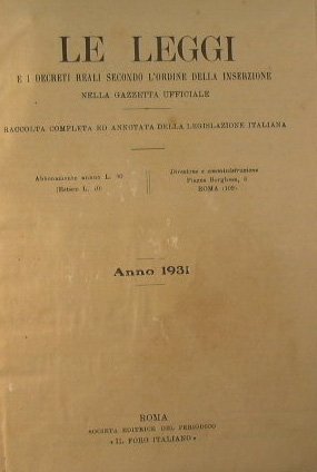 Raccolta completa ed annotata della legislazione italiana - in 8° - pp.1480 - Mezza pelle con titolo in oro al dorso - Abrasioni alla legatura