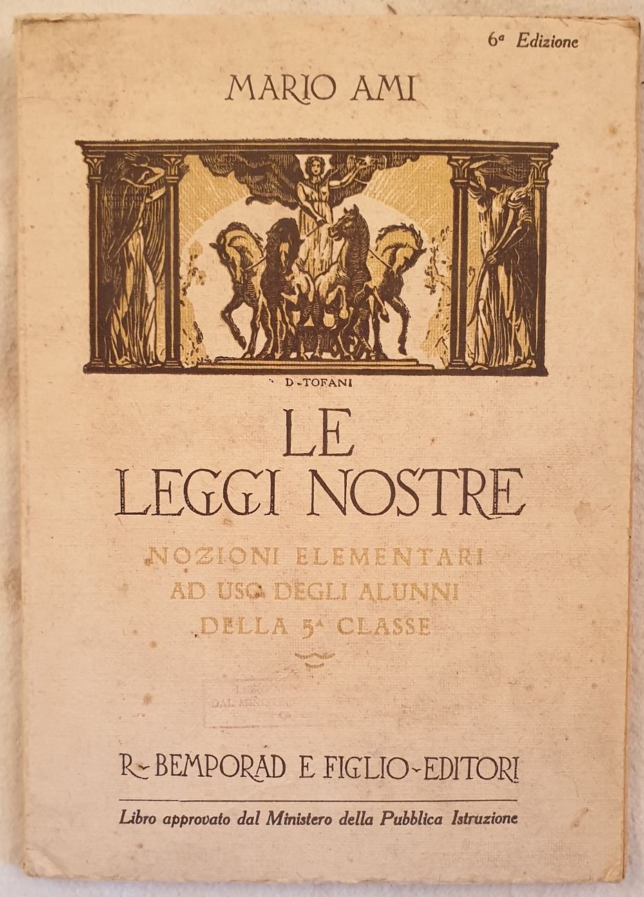 Edizione del 1925 di questo volume con nozioni di diritto ed economia scritto da Mario Ami, libro di testo per la quinta classe elementare. All'interno: I poteri pubblici, l'amministrazione dello stato, l'amministrazione della giustizia, la legge penale, i diritti civili, il diritto commerciale, le leggi relative al lavoro ecc. Piccola illustrazione in copertina di Tofani. In buone condizioni. Copertina editoriale in buone condizioni generali con lievi usure ai margini e dorso. Legatura in buone condizioni. All'interno le pagine si presentano in ottime condizioni con rare fioriture. In 8. Dim. 19,5x14 cm. Pp. 87+(1). Edition of 1925 of this volume with notions of right and economy written by Mario Ami, book of text for the fifth year of primary school. Little illustration in the the cover by Tofani. In good conditions. Editorial cover in good general conditions slightly worn in the edges and spine. Binding in good conditions. Inside pages are in very good conditions with occasional foxings. In 8. Dim. 19,5x14 cm. Pp. 87+(1).