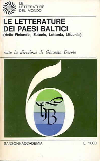 Nuova edizione aggiornata. 570 p. : 20 x 12 cm. Le letterature del mondo. Il libro raccoglie per la prima volta in un unico volume le varie letterature dei paesi baltici. Gli autori scelti da Giacomo Devoto sono stati tutti specialisti di queste letterature. Il volume fa parte di: «Le letterature del mondo», enciclopedia universale delle letterature diretta da Riccardo Bacchelli, Giovanni Macchia e Antonio Viscardi. Brossura editoriale, coperta in cartoncino flessibile plastificato opaco illustrato a colori. Nel frontespizio annotazione ms. con firma di appartenenza. Alcune annotazioni ms. a commento dell'opera, qualche segno del tempo, ingiallimento della carte, piccole lacerazioni ai profili dovuti alla qualità della carta stessa e alla rilegatura non cucita. Codice libreria 2269.