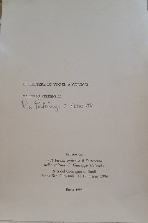 LE LETTERE DI VOGEL A COLUCCI - ESTRATTO DA "IL PICENO ANTICO E IL SETTECENTO NELLA CULTURA DI GIUSEPPE COLUCCI" - ATTI DELCONVEGNO DI STUDI, PENNA SAN GIOVANNI 1996