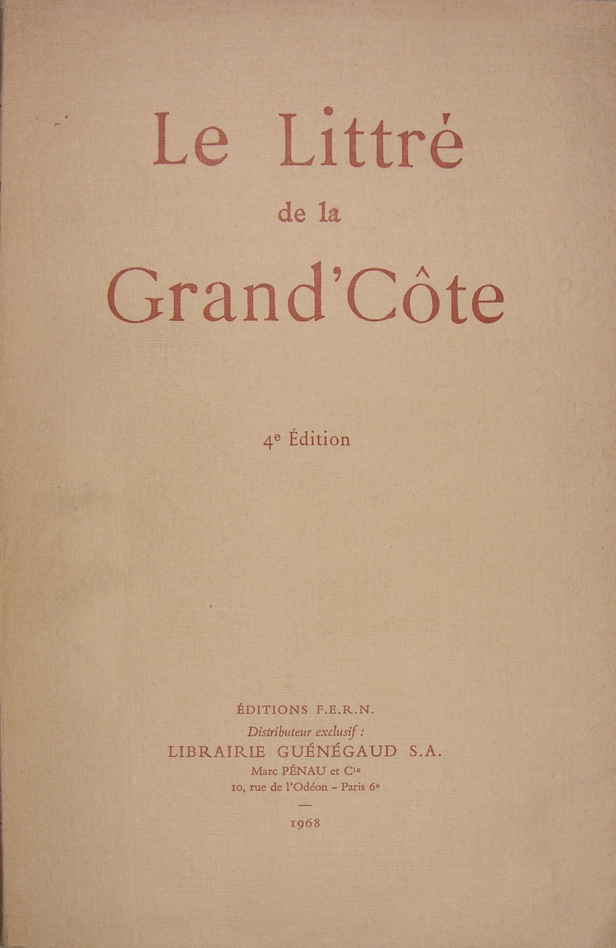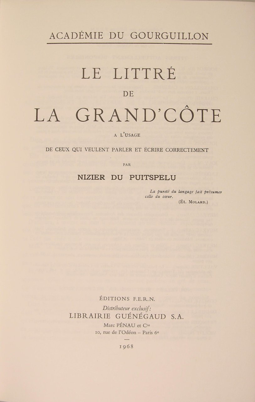 Librairie Guénégaud S.A 1968, in/8 broché, couverture illustrée, 353 pages. Le Littré de la Grand'Côte à l'usage de ceux qui veulent parler et écrire correctement est un ouvrage rédigé par l'écrivain lyonnais Clair Tisseur sous le pseudonyme de Nizier du Puitspelu. Il est publié pour la première fois en 1894 sous l'égide de l’Académie du Gourguillon, inquiète de la disparition du parler lyonnais. Il a été réédité depuis à plusieurs occasions. Présenté comme un dictionnaire, il est considéré comme la bible du parler lyonnais et regroupe de nombreuses expressions et anecdotes cocasses.