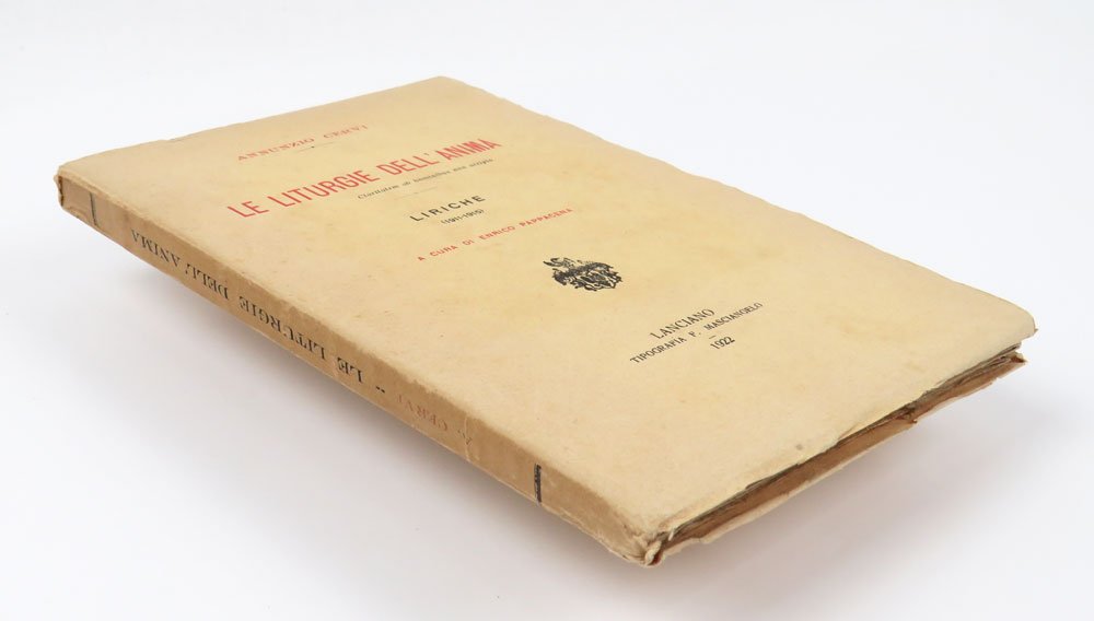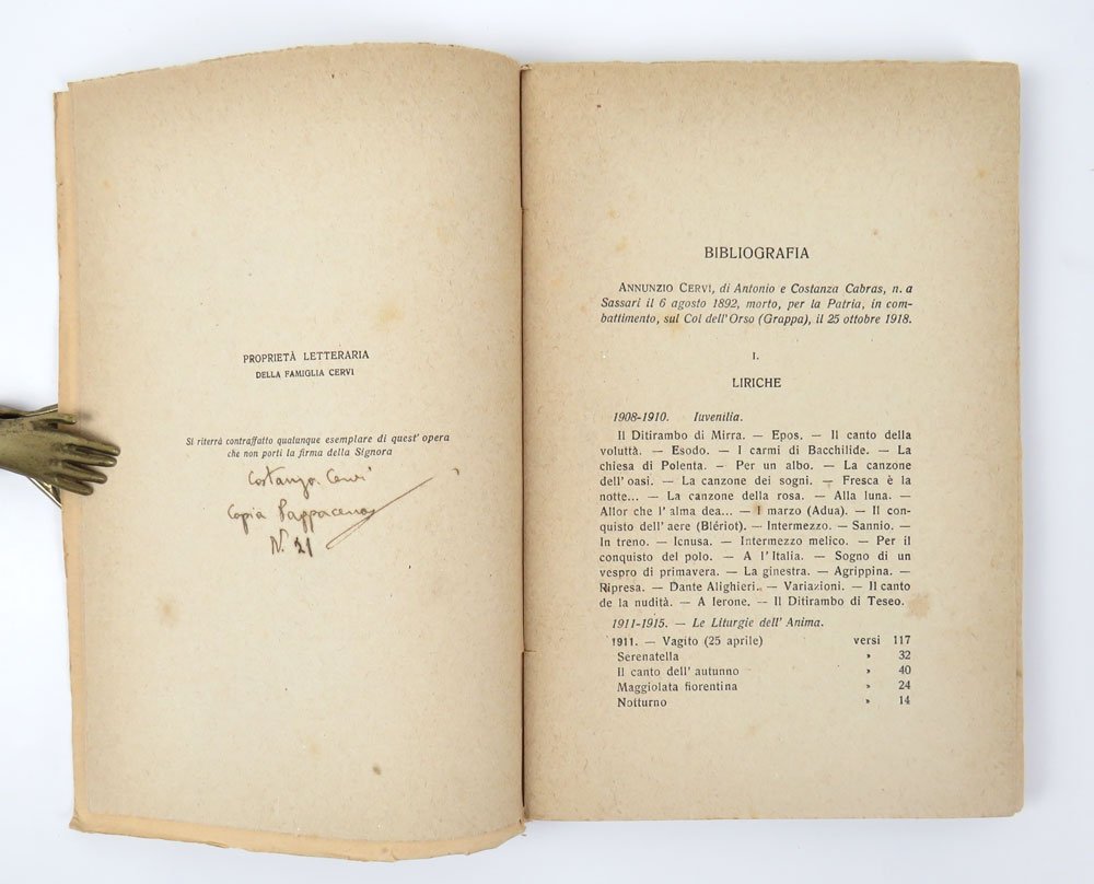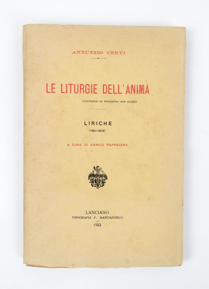 LIBROEdizione originale.Ottimo esemplare pregiato da firma autografa di Costanza Cervi, la madre del poeta prematuramente scomparso, la quale aggiunge: «Copia Pappacena | N. 21».Come la raccolta d’esordio («Le Cadenze d’un monello sardo», Napoli 1917), anche questo secondo libro poetico di Annunzio Cervi è molto raro. Contiene la produzione lirica 1911-1915, precedente alle «Cadenze», e avrebbe dovuto intitolarsi «Simboli senza periscopio» — con esplicito richiamo al simbolismo che informa molti di questi versi. Ma l’autore morì in guerra a soli ventisei anni, poco prima della cessazione delle ostilità, e la pubblicazione venne intrapresa per le cure del collega e amico Enrico Pappacena (furono entrambi allievi dell’ultimo Michele Kerbaker). Pappacena intervenne sul titolo e «ne mutò anche l’“impalcatura”: escluse a suo piacimento alcune liriche e ne aggiunse diverse altre; ne cambiò l’ordine, ne “completò” una e inserì per errore anche un sonetto di Arturo Graf (Sonetto minimo, in “Dopo il tramonto”, Treves 1893, p. 235, intitolato dal Pappacena “Ora che i rami.”) evidentemente ricopiato da Cervi e lasciato fra le sue carte» (Tanchis e Pusceddu, p. 10).Cammarota, Futurismo, 106.6; Tanchis e Pusceddu, Cervi: Le cadenze e altre liriche e prose (Milano 2018)