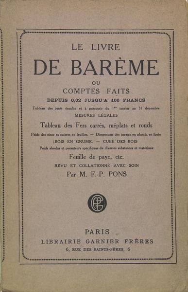Paris, Librairie Garnier, 1931. In/8 broché, couverture imprimée, 463 p., 28 p. de catalogue. Tableau des jours écoulés et à parcourir du 1er janvier au 31 décembre, Mesures légales, tableau des fers carrés, méplats et ronds, poids des zincs et cuivres en feuilles, dimensions des tuyaux en plomb, en fonte, bois en grume, cube des bois, poids absolus et pesanteurs spécifiques de diverses substances et matériaux, feuille de paye, etc.