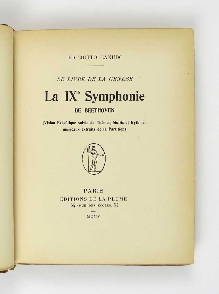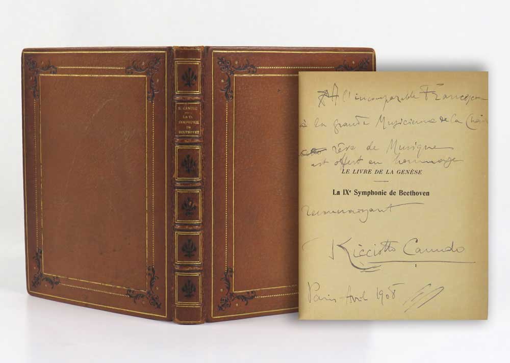 LIBROEdizione originale.CON AUTOGRAFO.Ottimo esemplare nella serie dei 400 non numerati, a fogli diseguali, in legatura di pregio, impreziosito da lunga e bella dedica autografa dell’autore all’occhietto, datata «Paris Avril 1908».Elaborato saggio di filosofia e letteratura musicale, oggi molto raro. Ne furono tirati solo 531 esemplari dei quali i primi 130 di testa numerati e variamente assemblati (n. 0 su pergamena, 1-7 su Giappone Imperiale, 8-14 su Olanda, 15-30 su Cina, 31-130 «de luxe») e i restanti 400 non numerati. «La ‘Genèse’ di Canudo può essere alla fin fine uno dei tentativi — forse tra i meno rozzi — di dare alla musica quel significato che non ha se non in se stessa, nella dimensione di organizzazione semantica dello spazio sonoro e nel tempo [.] quella che chiameremmo la prima “sistemazione cosmogonica” del proprio credo estetico. È la “Laus musicae” che Canudo scrive per Beethoven nella “Genèse” [.]. Assai notevole è per noi la constatazione di fatto che nel “Livre de la Genèse”, al di là di goffi approcci con uno scientismo di facciata [.], è presente quasi esclusivamente un background che potremmo definire wagneriano per l’ottica miticheggiante, per la visione estetico totale e, dato non trascurabile, per un certo gusto dello stesso idioma wagneriano che corre per tutto il libro [.]. I quattro tempi della Nona vengono in tal modo scanditi da altrettanti quadri: il primo, quello de “Le Brouillard Cosmique” (La Formazione dei Mondi) corrisponde all’Allegro ma non troppo un poco maestoso beethoveniano; il secondo, “Le Marche des Mondes” (La Nascita della Terra) allo Scherzo molto vivace; il terzo, “La Nuit Religieuse” (La Nascita dell’uomo) all’Adagio molto cantabile ed il quarto, “Le Triomphe de l’Homme” al Presto. Il tutto è contrappuntato da quarantuno rimandi musicali che si snodano senza soluzioni di continuità secondo il progredire del testo» (Moliterni, Le Livre de la Genèse, in: Ricciotto Canudo 1877-1977, pp. 125-139).