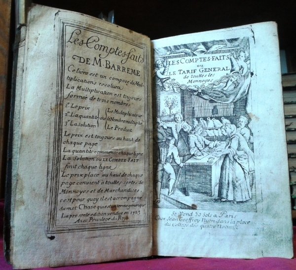 Volume in 8 antico, legatura coeva in piena pelle, titolo al tassello al dorso a cinque nervi, riccamente ornato da fregi in oro, tagli colorati, sguardie (varie annotazioni a pennino), doppio frontespizio di cui uno figurato inciso su rame raffigurante l'interno di un ufficio contabile nel pieno fervore della sua attivit, catalogo delle opere dellautore, (8) 500 pp., non numerate di tabelle monetarie, prezzi e tariffe, istruzioni ed esempi di operazioni di cambio, carta di privilegio in fondo al volume. Rara edizione del celebre tariffario generale, indispensabile nella Francia del XVIII secolo, compilato dal direttore della Scuola di Commercio, e maestro di conti a Parigi (famosa 'L'arithmtique du Sr. Barreme, ou le livre facile pour apprendre l'arithmtique de soi-mme, & sans Matre'). Alcune pagine occasionalmente brunite, una lieve gora allangolo inferiore delle ultime carte, mende duso alla legatura con piccole mancanze alle cuffie. In pi che buone condizioni generali. Completo e collazionato.