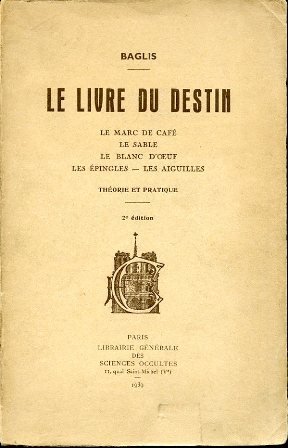In-8°, pp. 59, brossura editoriale. Alcune figg. n.t. Ottimo stato. Seconda edizione di questo trattato divinatorio concernente varie discipline della mantica: caffeomanzia, divinazione tramite la sabbia, ovomanzia (tramite il bianco d'uovo), spillomanzia, agomanzia (o acutomanzia, la divinazione tramite gli spilli). 'Baglis' è pseudonimo di Louis Chacornac.