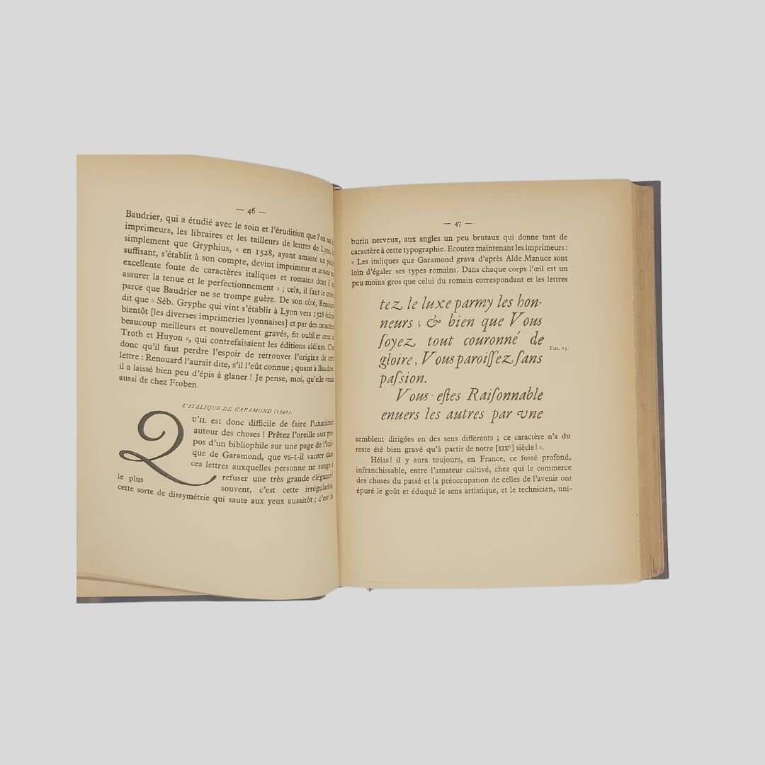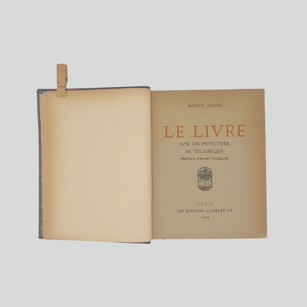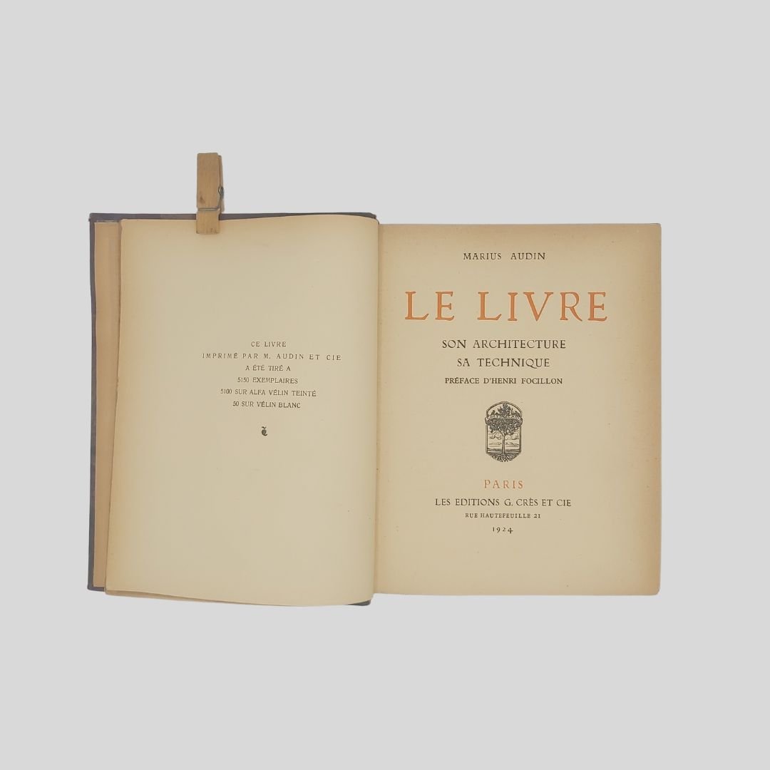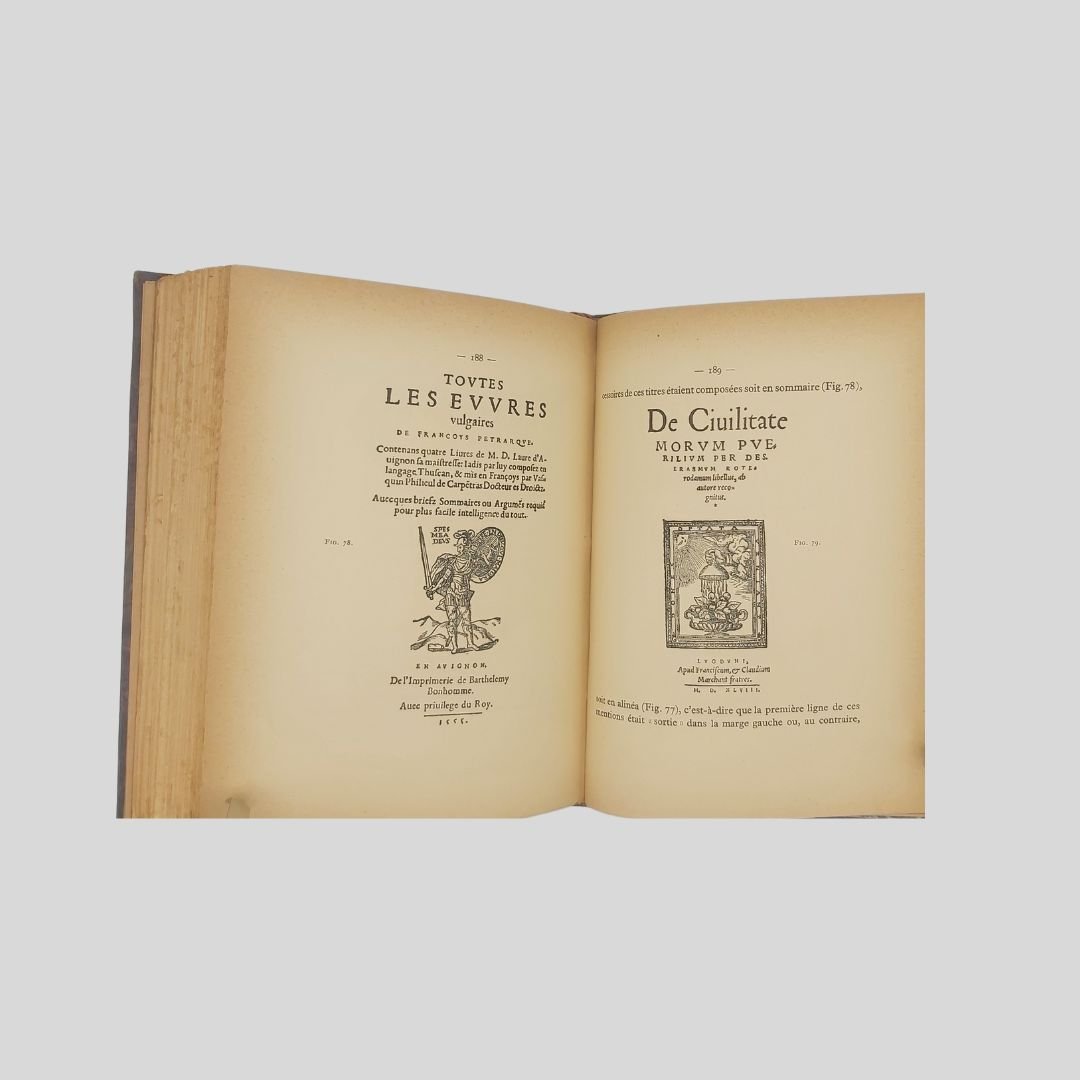 In-8° (cm 21,8×17), pp. XIII,(2),280. Préface d’Henry Focillon. Frontespizio con caratteri in rosso e nero. Completo dell' errata-corrige, testatine, capolettera e finalini. Elegante edizione “sur alfa vélin teinté”. Con 123 figg. intercalate, alcune a p. pagina: Font, riproduz. da antiche stampe, frontespizi etc. Bella legatura in mz. marocchino blu, piatti marmorizz., tit. oro al dorso a 6 scomparti, nervetti, taglio dorato, sguardie in carta marmorizzata. Spellature al dorso e piccola incrinatura all’unghia. Conserva le copertine e il dorso editoriale. Interno in ottimo stato di conservazione.