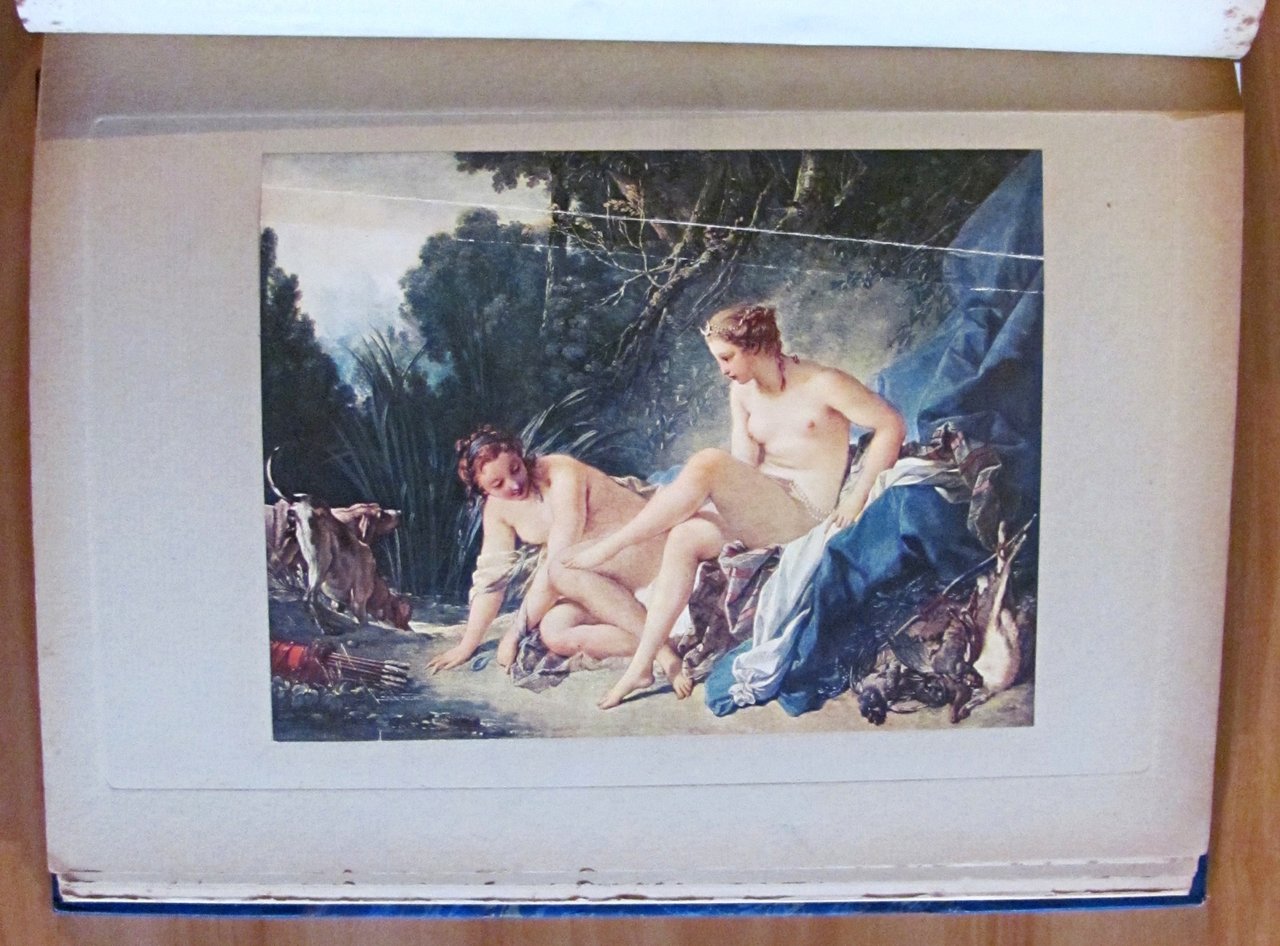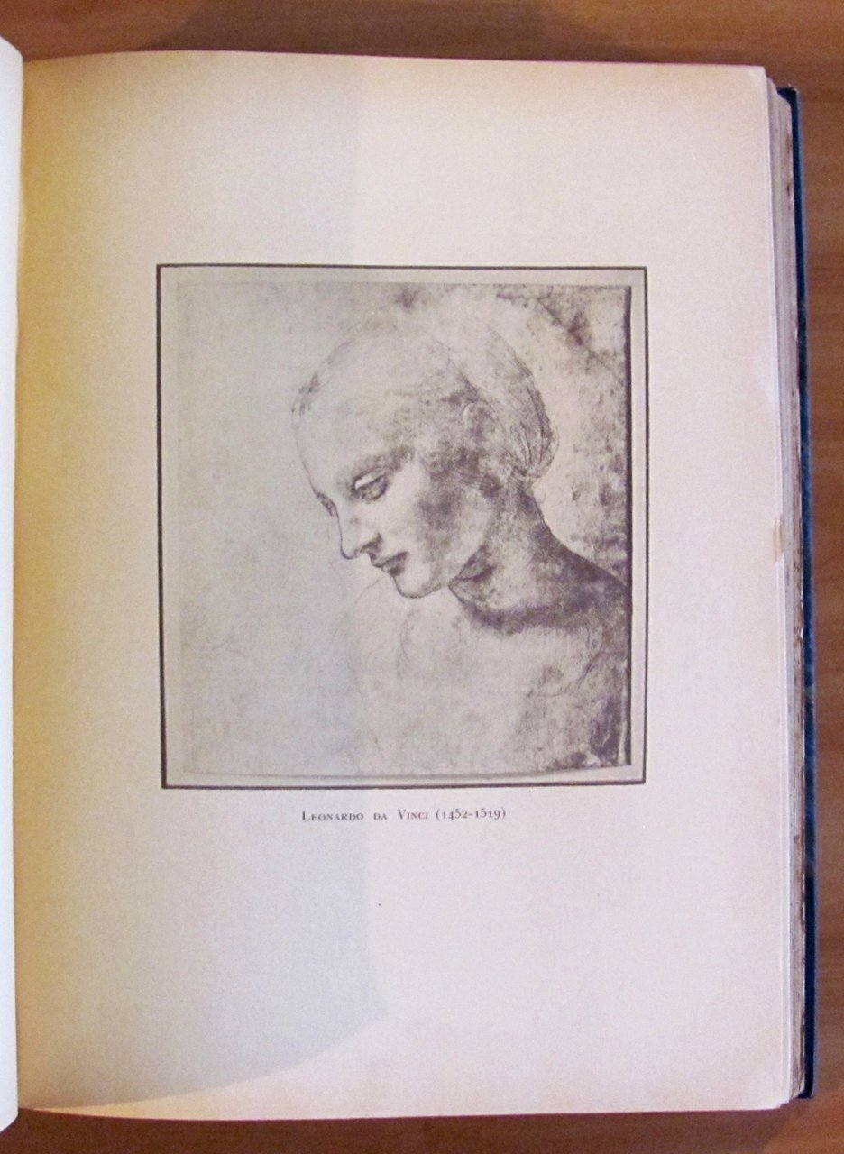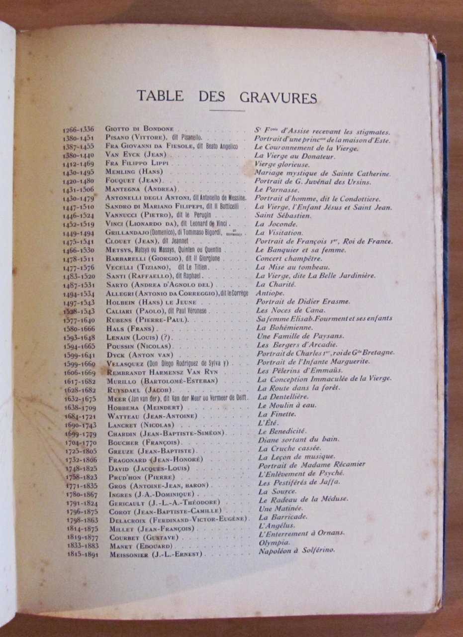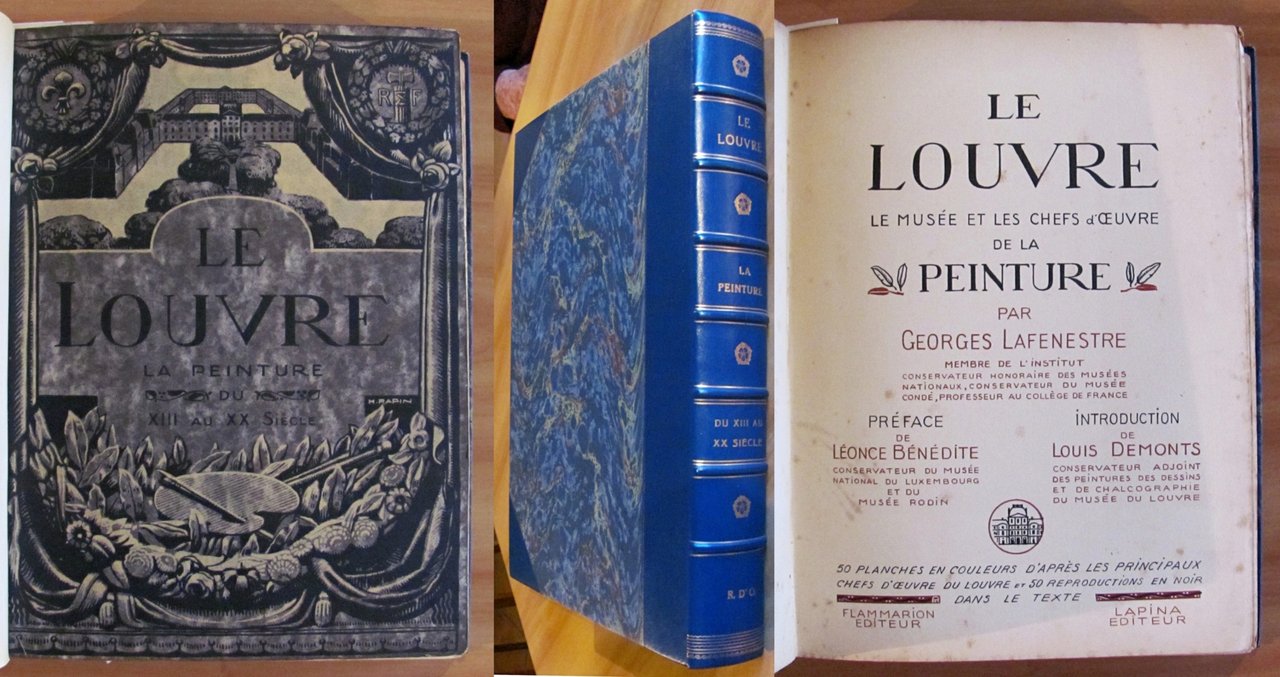 Belle testatine in sanguigna n.t., tavole monocromatiche f.t. e 49 tavole a colori f.t. applicate su cartoncino (manca la tavola N.50 "Napoleone a Solferino" di Meissonier) ciascuna preceduta da una pagina di descrizione dell'opera e di biografia dell'autore. Ed. Flammarion Lapina - Paris, s.d. 1920 circa. Rilegato in mezza pelle, con nervi e titoli in oro al dorso, con copertine originali in brossura conservate all'interno. Lievi fioriture del tempo in qualche pagina, ma libro freschissimo e in Ottimo stato. 28x38. Raro e Ottimo. , Ottimo (Fine)