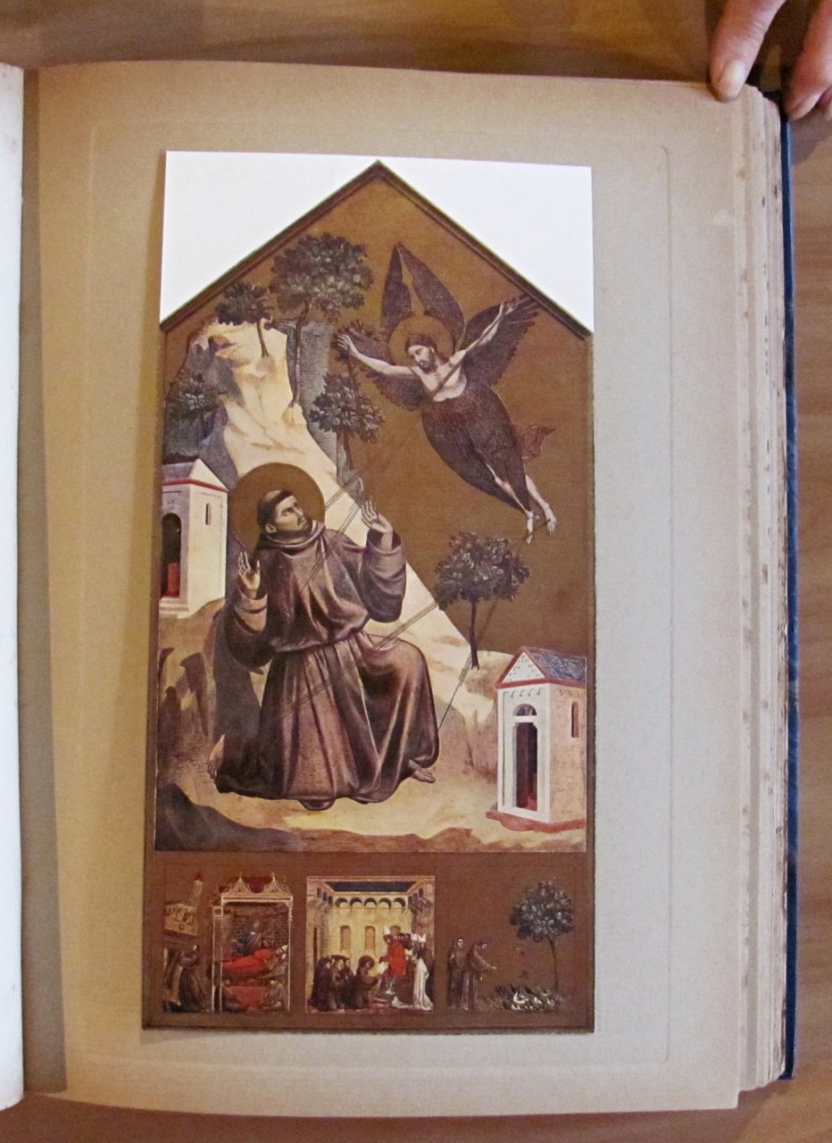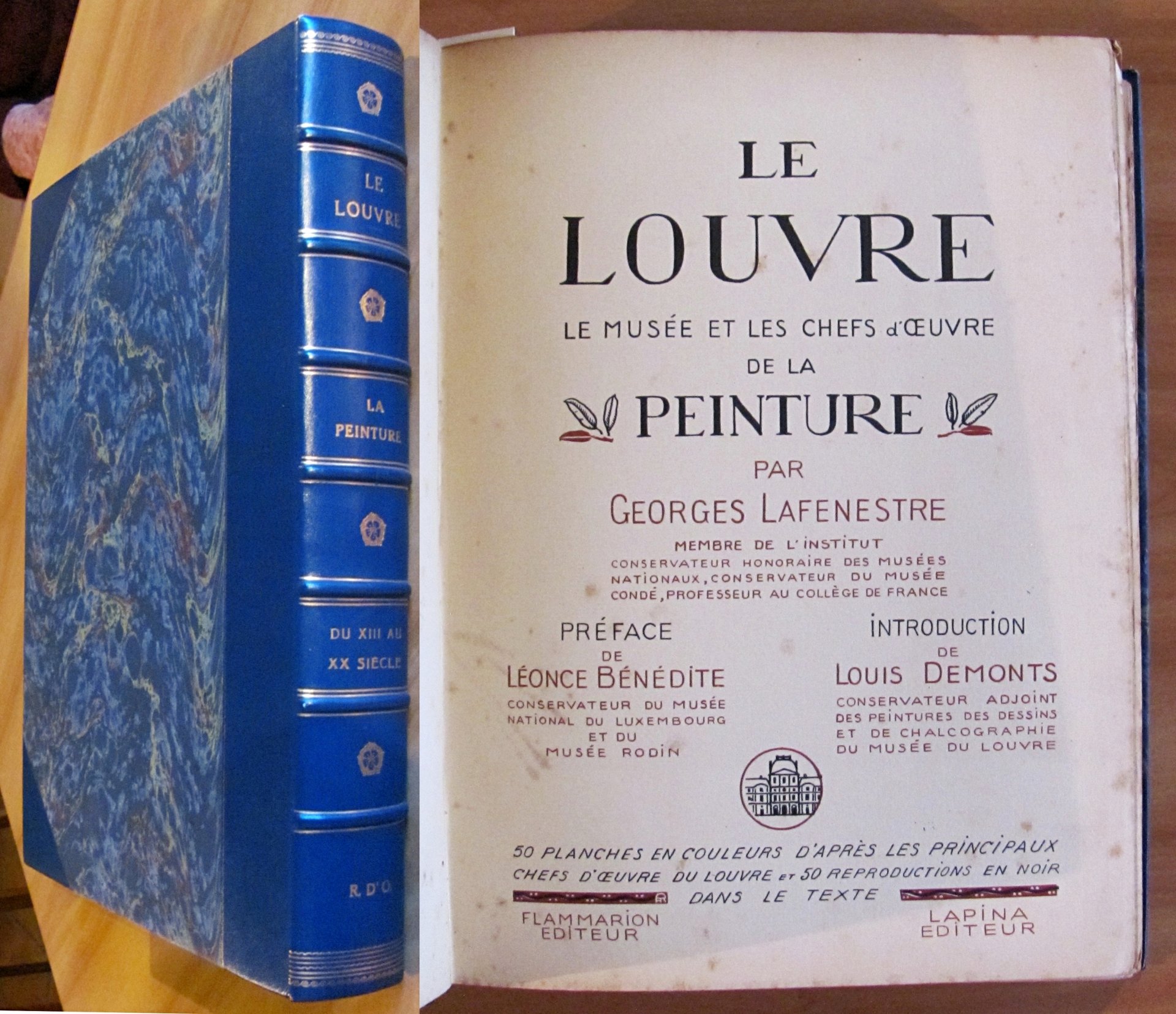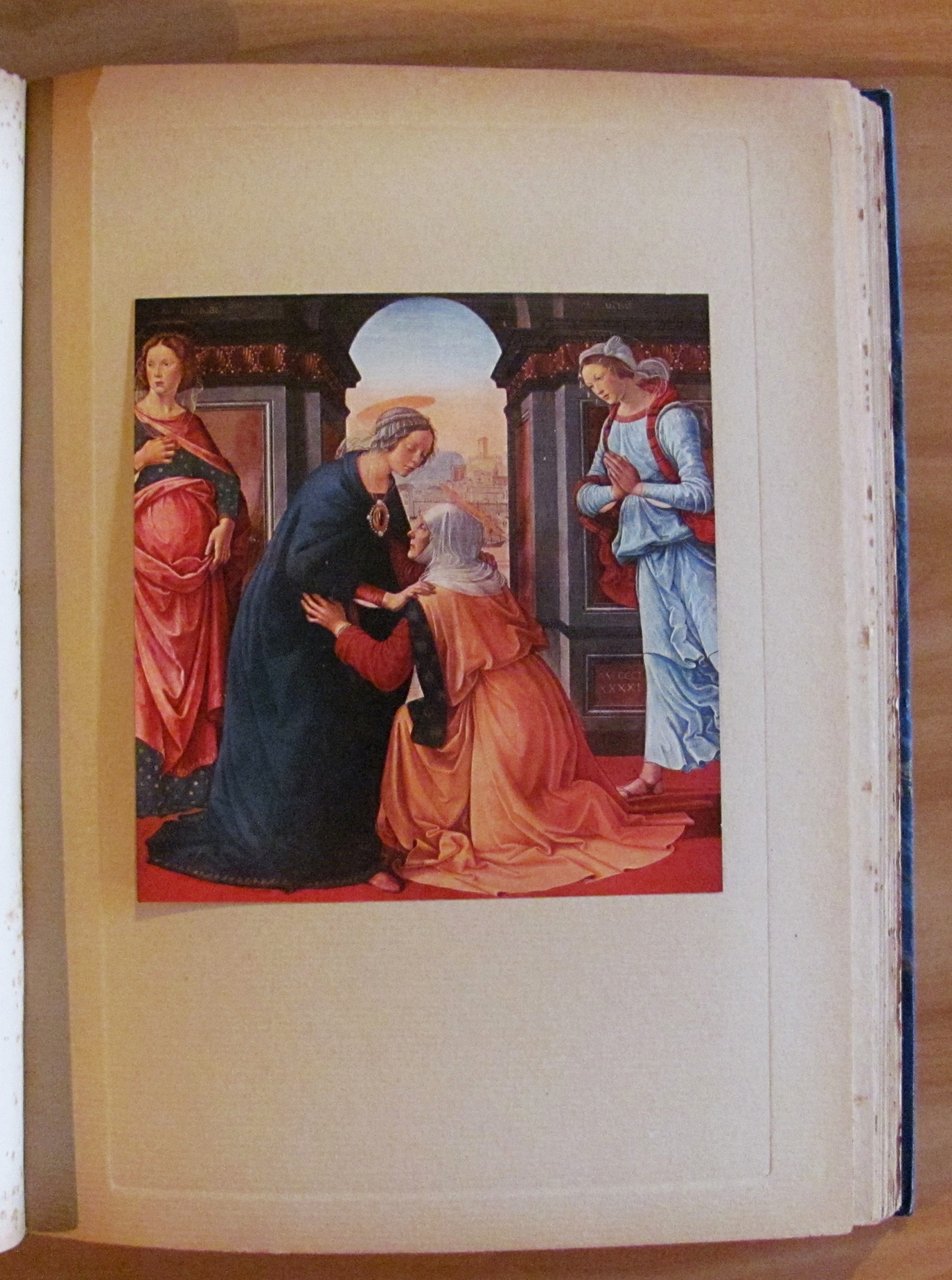 Belle testatine in sanguigna n.t., tavole monocromatiche f.t. e 49 tavole a colori f.t. applicate su cartoncino (manca la tavola N.50 "Napoleone a Solferino" di Meissonier) ciascuna preceduta da una pagina di descrizione dell'opera e di biografia dell'autore. Ed. Flammarion Lapina - Paris, s.d. 1920 circa. Rilegato in mezza pelle, con nervi e titoli in oro al dorso, con copertine originali in brossura conservate all'interno. Lievi fioriture del tempo in qualche pagina, ma libro freschissimo e in Ottimo stato. 28x38. Raro e Ottimo. , Ottimo (Fine)